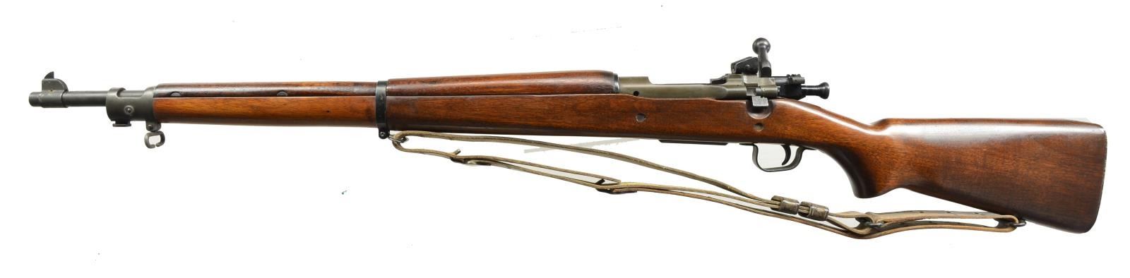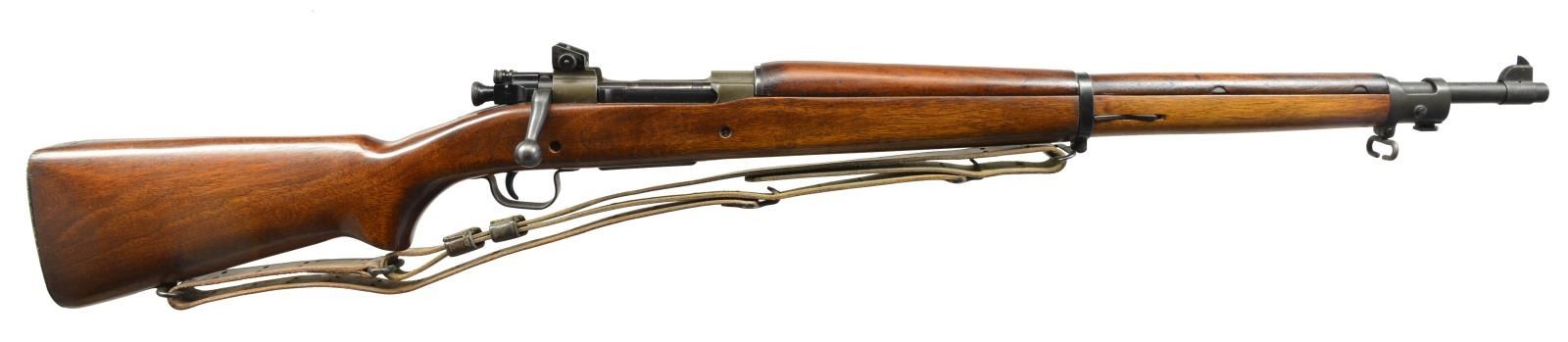 Cal. 30-06. S# 3993987. Bbl. 24". All bolt parts marked “R”. Cut off marked “R”. Adj. aperture rear sight. Blade front sight, sight base marked “R” & blade marked “C”. 2-Groove bbl. marked behind front sight “RA”, flaming bomb & “9-43”. Milled upper band. Balance of furniture stamped, including correct lg. bow trigger guard. Checkered trap buttplate. Walnut stock set w/ unmarked pistol grip, “A4” type stock w/ 2 recoil bolts. Unmarked, vintage Model 1907 style sling. Sling has wear, flexing & cracking. CONDITION: stock set has very nice appearance w/ scattered, sm. handling marks. 85% original parkerized finish w/ light wear, scattered scratches. Very good, shiny bore. (20-1870/RW). CURIO. $500-800.