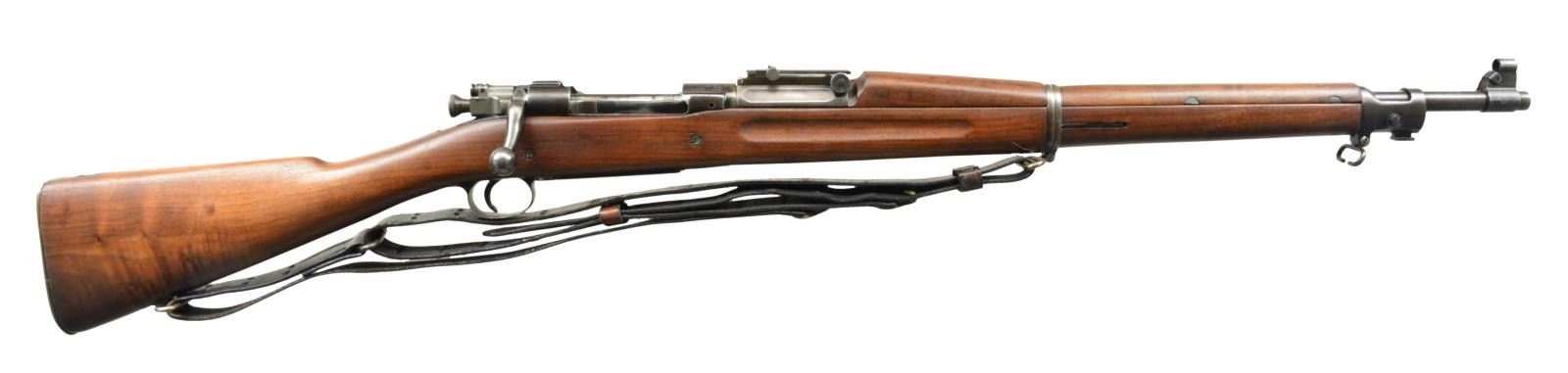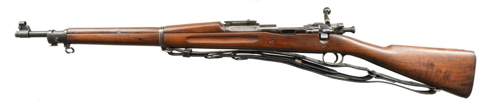 RIFLE. Cal. 30-06. S# 1097387. Bbl. 24". Receiver mfg. w/ slot in left rail as ejection port for the Pedersen device. Rifle has correct Pedersen cut off, retaining pin & trigger. Bbl. marked behind front sight “SA”, flaming bomb & “8-19”. Replacement 1903A3 bolt marked on top w/ inverted “7” & punch mark underneath bolt handle. Ladder rear sight graduated to 2850yds. w/ volley notch. Flat, windage & elevation knobs. Blade front sight w/ protective slip on hood. All milled furniture w/ smooth trap buttplate. Vintage 1907 style sling w/ extensive wear, cracking & flexing. Unmarked straight grip. Walnut stock marked only w/ faint, encircled “P” under grip w/ correct cut out below ejection port & 2 recoil bolts. CONDITION: stock has arsenal rework type finish w/ loss of wood in inletted areas w/ light wear & handling marks. Approx. 4" long area of replaced wood on forward left side of hand guard. Metal has 60% original finish w/ wear, thinning & light handling marks. Good, shiny bore has lightly worn lands. (20-1991/RW). CURIO. $500-700.