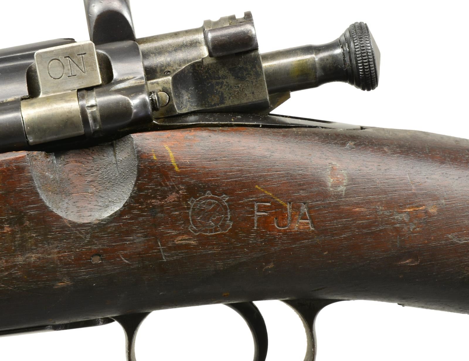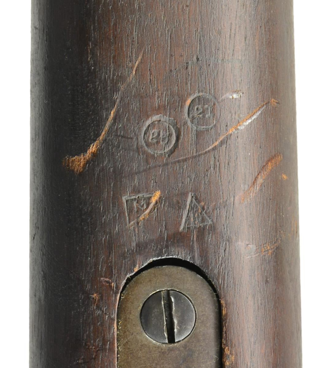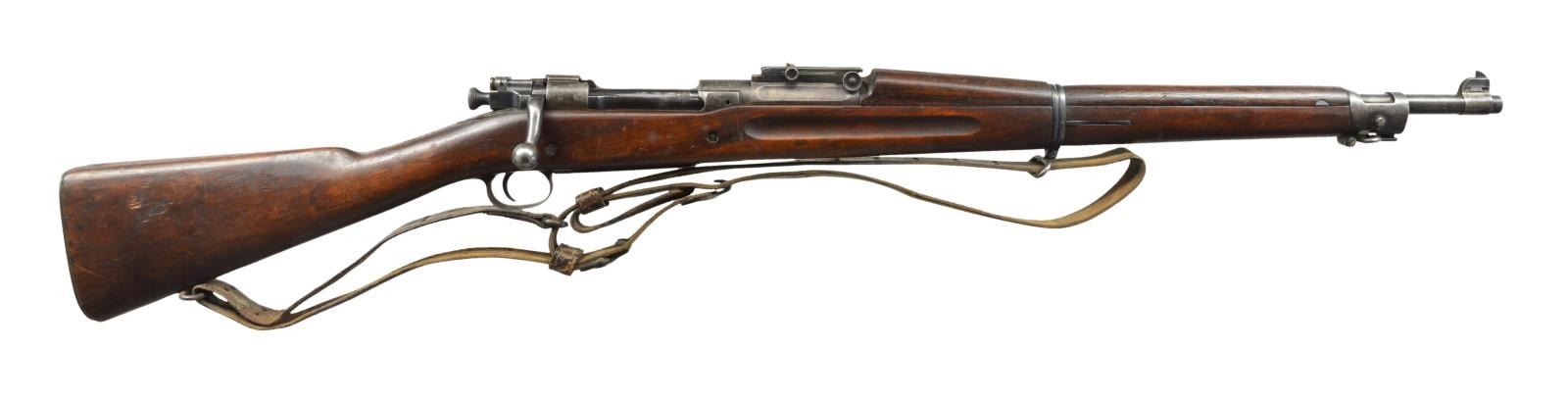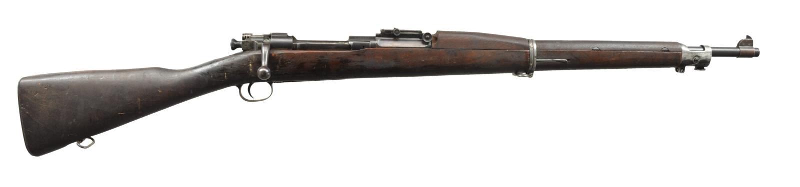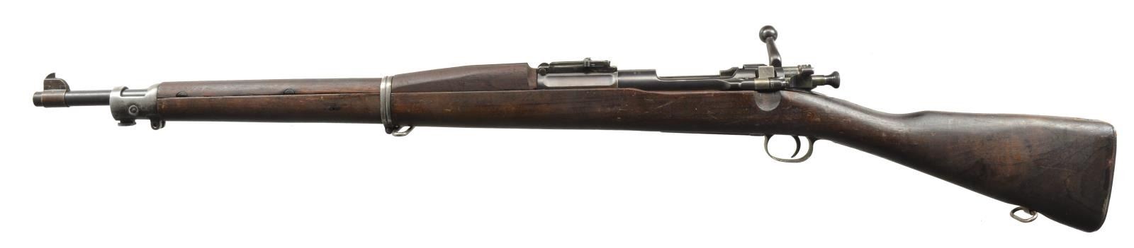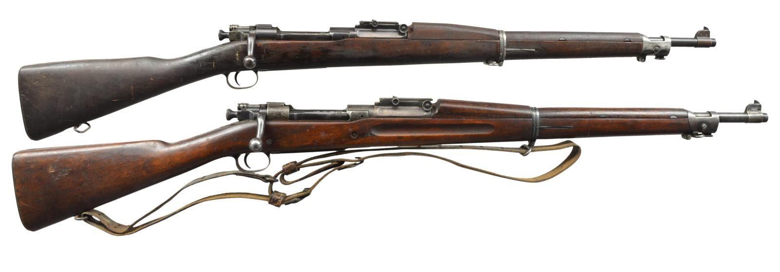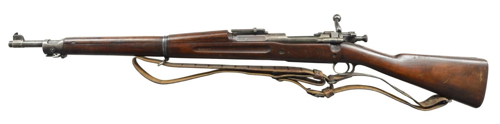 1) ROCK ISLAND ARSENAL MODEL 1903. Cal. 30-06. S# 146374. Bbl. 24" marked behind front sight “RIA”, flaming bomb & “1-17”. Ladder rear sight, cross bar at top of slide has been removed. Dished & grooved windage knob w/ dished elevation. Blade front sight. Straight down bolt handle marked underneath w/ “C14”. Milled upper band, stacking swivel is not present. Milled lower band & trigger guard. Stamped butt swivel & fine checkered stamped buttplate. Walnut stock set. Replacement stock w/ 2 recoil pins is 1903A3 WW2 production, marked on forend tip w/ flaming bomb & marked over trigger guard on left side “FJA” & crossed cannons. Marked w/ circle “P” under pistol grip. CONDITION: stock has light wear w/ crisp markings but dark, stained appearance w/ notable sm. dents & scratches. Metal is mix of blue turning gray & patina. Receiver has added arsenal type blue finish. Bbl. bands have had finish removed & are mostly in the white. Fair, shiny bore w/ worn lands. (20-2972/RW). 2) SPRINGFIELD MODEL 1903. Cal. 30-06. S# 393652. Bbl. 24" marked behind front sight “AV”, flaming bomb & “1-18”. “AV” is Avis Gun Co., who mfg. field replacement bbls. for 1903 rifles from 1917-1919. Ladder rear sight graduated to 2850 yds. w/ cupped elevation & windage knobs. Blade front sight. All milled furniture, including smooth trigger & smooth trap buttplate. Bolt marked underneath w/ punch mark & “7”. Under safety lug appears “J8”. Walnut stock set w/ 2 recoil bolts, marked w/ “RI” at forend tip, marked w/ “5” behind trigger guard & marked “ROBERT” initialed in left grasping groove. 1907 Leather sling marked “HOYT 1918 J.J.M.”. CONDITION: stock has nice, original finish w/ light wear, scratches, staining & handling marks throughout. Metal has turned overall gray & patina w/ notable mottled appearance. Fair, worn bore turning dark. (20-2997/RW). BOTH CURIO. $800-1,400.