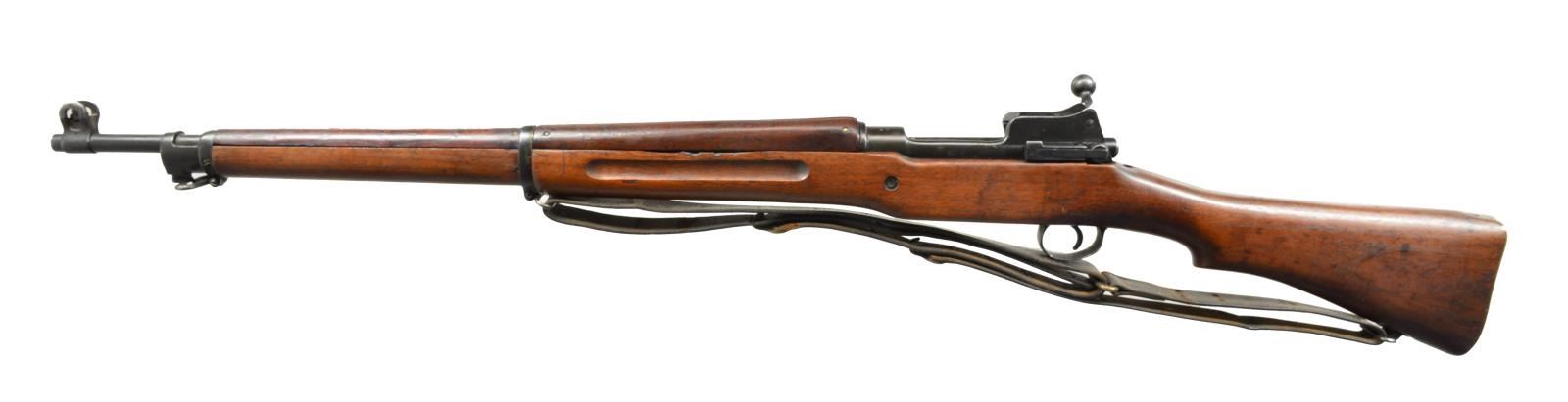 Cal. 30-06. S# 111132. Bbl. 26". Nice example of Winchester made Model 1917 rifle w/ mostly correct parts. Receiver, bolt, stock & bbl. all marked “W”. Bbl. marked behind front sight “W”, flaming bomb & “1-18”. Ejector housing & rear sight marked “E”. Receiver marked on left side w/ flaming bomb & encircled star. The star marking is thought to indicate rifles that were to be kept state side & not over seas due to parts interchangeably issues in early production rifles. Walnut stock & hand guards. Vintage leather military style sling. Sling has extensive wear, staining, scuffing & flexing. Upper sling hook has been modified. CONDITION: stock set has lg. percentage of original finish w/ light wear, staining & scratches throughout. Stock has notable missing chip of wood over top of left grasping groove. Additional wear on handguards indicate possible replacements. Rifle retains 70% original blue finish w/ wear & scattered spots of missing finish. Bore turning dark in grooves w/ strong lands. (20-1873/RW). CURIO. $400-600.