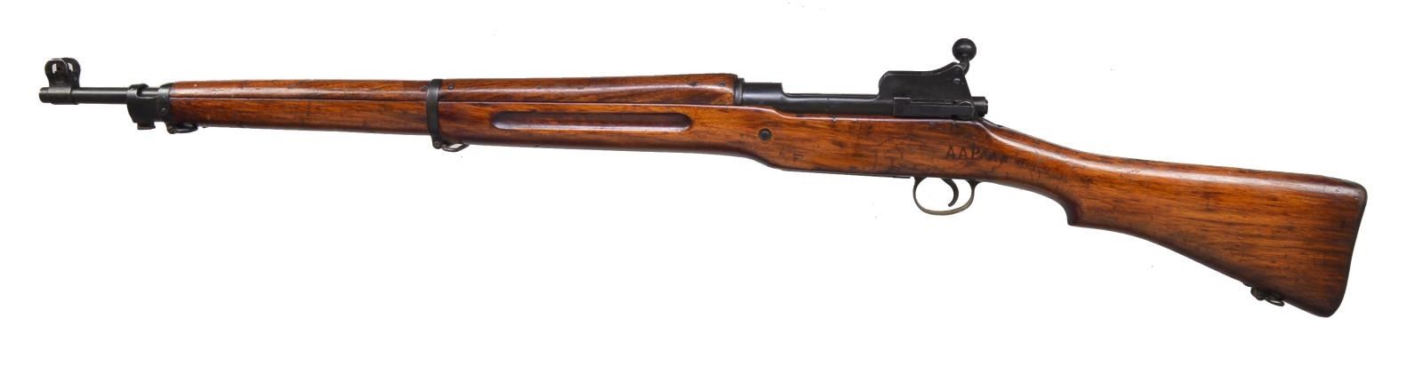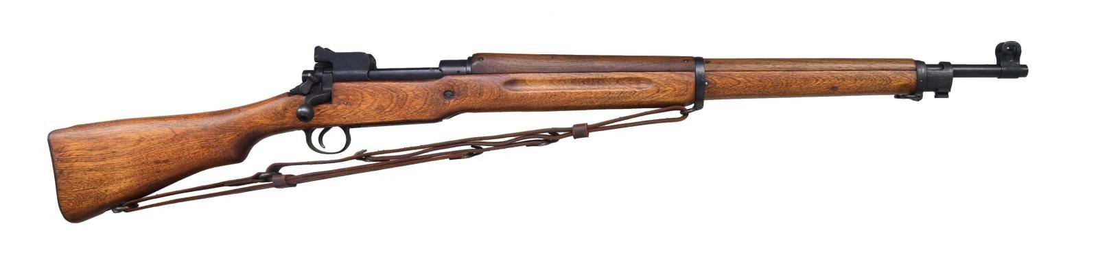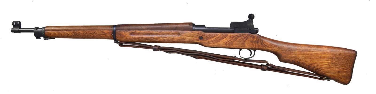 ALL: cal. 30-06. Bbls. 26" marked "E / flaming bomb". Protected blade front sights w/ aperture receiver sights. Band fastened walnut stocks & handguards w/ trapdoor buttplates & sling swivels. Front bands have bayonet lugs & stacking swivels. 1) S# 1063333. Bbl. dated "6-18". Military style leather sling on original swivels. Left side of stock has "OGEK" rework mark. CONDITION: metal has 80% dull reblued finish showing spots of pitting. Refinished stock shows scattered dents & marks. Bore is bright w/ strong rifling. (20-2943/DS). 2) S# 1235166. Bbl. dated "11-18". Left side of stock has "AAP AA 6 3 GH-A" rework markings. CONDITION: 80% dull lightly worn reblued finish. Refinished wood shows numerous dents & marks w/ cracks along left side of action & extending from both sides of buttplate. Dark pitted bore. (20-2945/DS). ALL CURIO. $500-700.