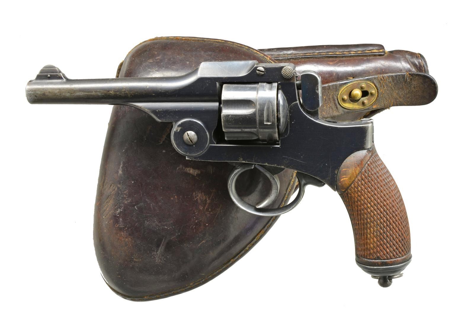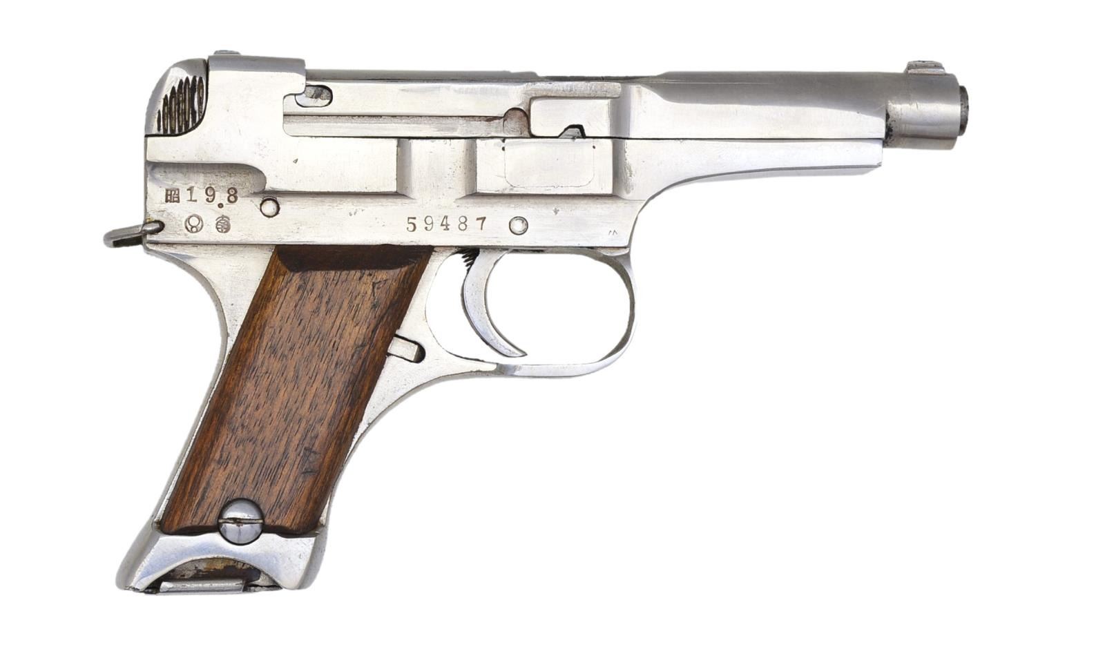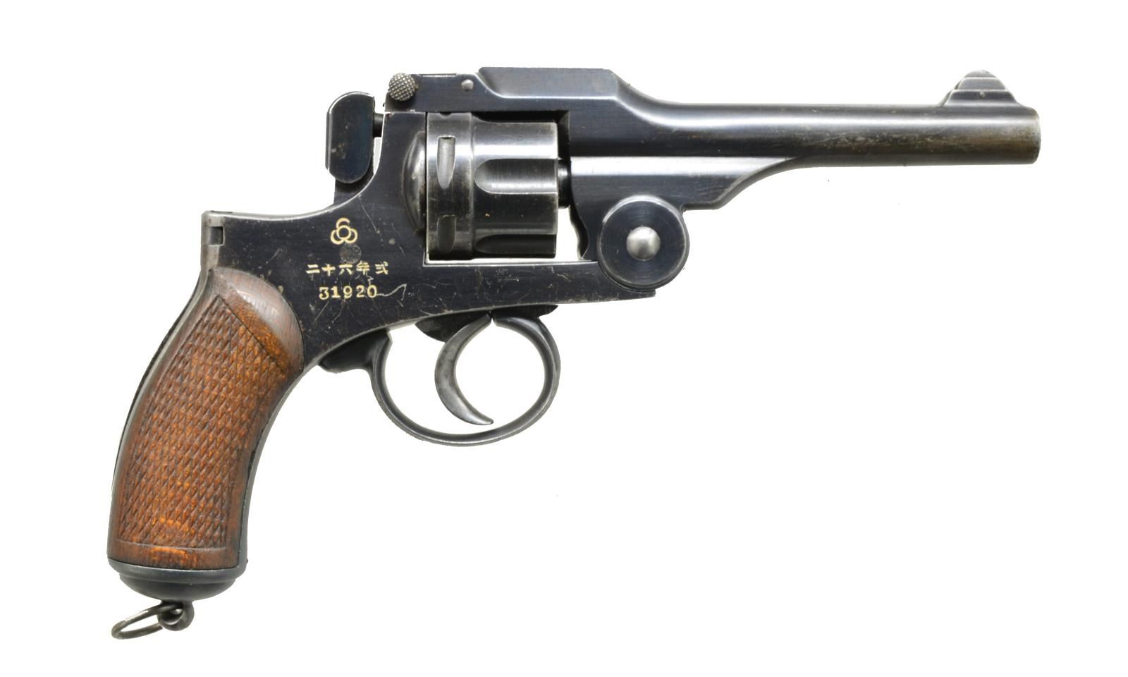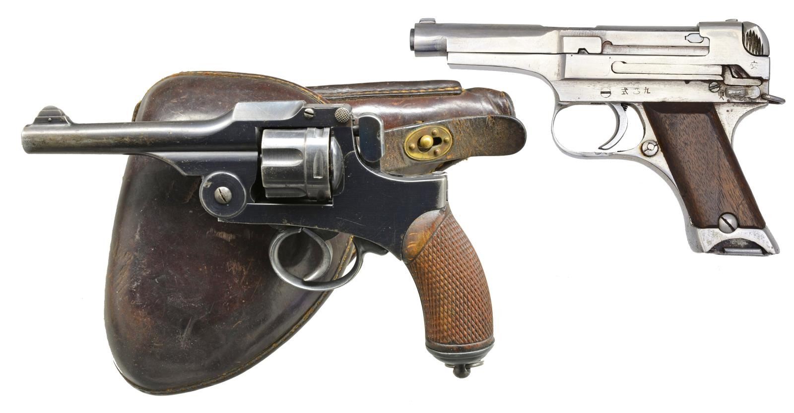 REVOLVER. 1) NAGOYA TYPE 94 SEMI-AUTO PISTOL. Cal. 8mm Nambu. S# 59487. Bbl. 3.8". Mfg. Aug. 1944 (1935-1945). Chrome plated w/ plain walnut grips. MAGS: good chrome plated, matching numbered 6 rd. CONDITION: good overall w/ prior pitting & military finish. In the white bbl. w/ very good bore having faint frosting. (20-2169/NW). 2) KOISHIKAWA TYPE 26 REVOLVER. Cal. 9mm. S# 31920. Bbl. 4.7". Mfg. 1893-1925. Functions DAO. Checkered hardwood grips. Matching numbered bbl., trigger & trigger guard. Bbl., cyl. & extractor numbered 32. UNATTACHED ACCESSORIES: good to very good brown leather clamshell holster w/ ammo pouch having cartridge loops inside. Single wide belt loop plus 2 wide shoulder strap loops. CONDITION: good to very good overall appearance w/ patina in grip area & buttcap. Light marks & prior light pitting along w/ typical high point holster wear. Very good grips; left loose in frame. Near excellent bore. (20--2172/NW). BOTH CURIO. $700-1,000.