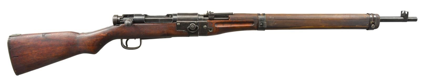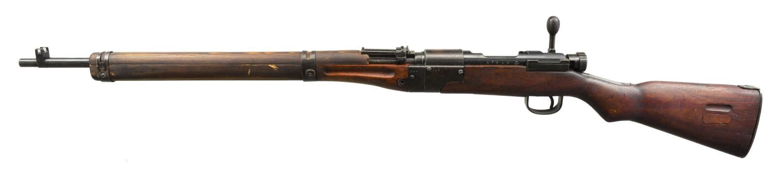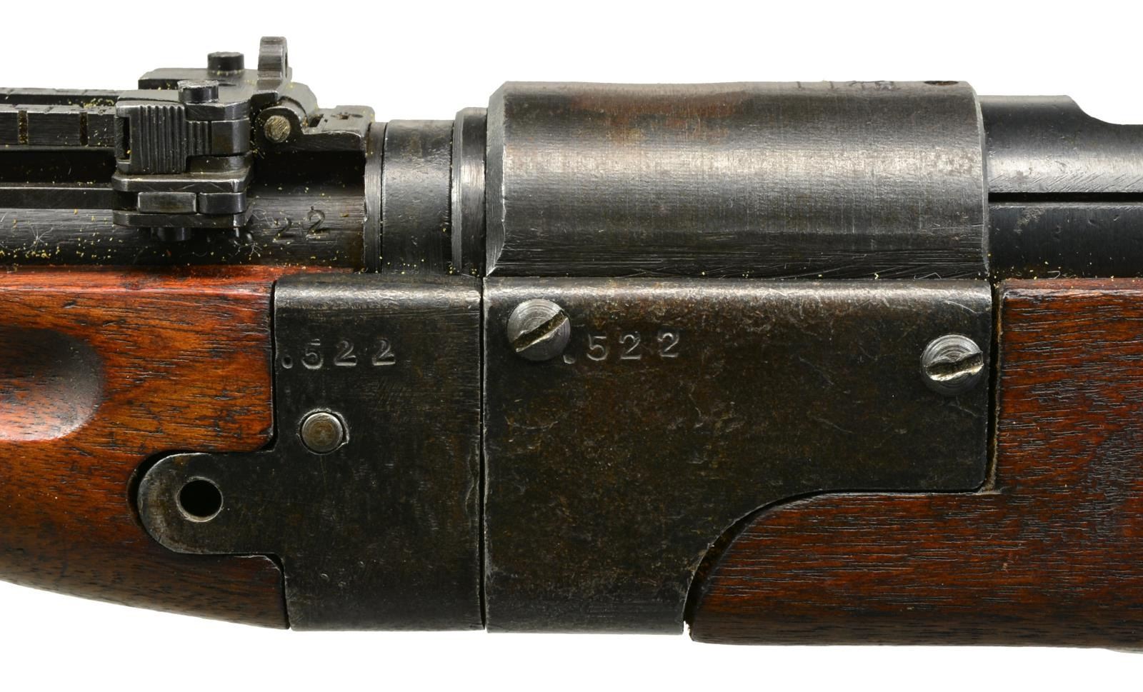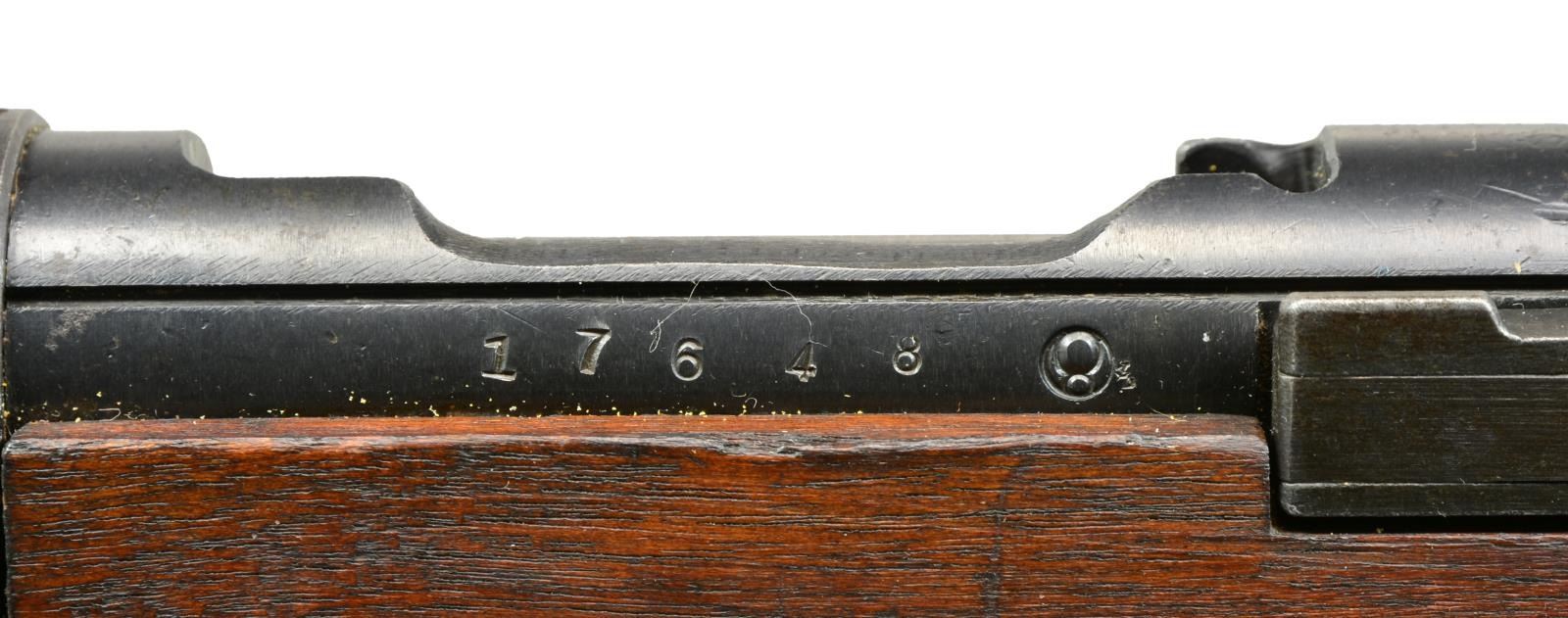 Cal. 7.7 Jap. S# 17648. Bbl. 25.25". Scarce takedown paratroop rifle mfg. at Nagoya arsenal. S# matches on receiver, bolt, extractor & bbl. lug. Assembly number 522 appears on left side of bbl. below rear sight, on left side of takedown assembly in front & rear. Receiver is marked on left rail w/ Nagoya arsenal marking. Mum has been removed, leaving Japanese characters for “Type 2”. Straight bolt handle w/ oval knob. Checkered, notched safety knob. Rear sight graduated to 1500m w/ antiaircraft wings. Inverted V front sight w/ protective ears. Hardwood stock set. Original forend was cut underneath lower band & original bbl. bands, forend tip & handguard were removed. Forend tip, handguard & upper band replaced w/ hobbyist gunsmith type workmanship & materials. Lower band is from later type rifle, made w/ out provision for monopod attachment. Original buttstock has had sling swivel removed & inletted area has been filled w/ wood. Original cup type buttplate has been replaced w/ shop made flat, steel buttplate. CONDITION: buttstock has been refinished w/ loss of wood in buttplate area. Has light wear & handling marks. Rear portion of forend w/ grasping grooves has original finish w/ staining & wear. Added wood has wear, staining & scratches. Metal retains 60% original blue w/ thinning & wear, turning gray & patina. Replacement bbl. bands have notable worn finish. Transverse forend screw in forward attachment block is not present & screw retaining nut in upper band is not present. Good, shiny bore. (20-1932/RW). CURIO. $700-900.