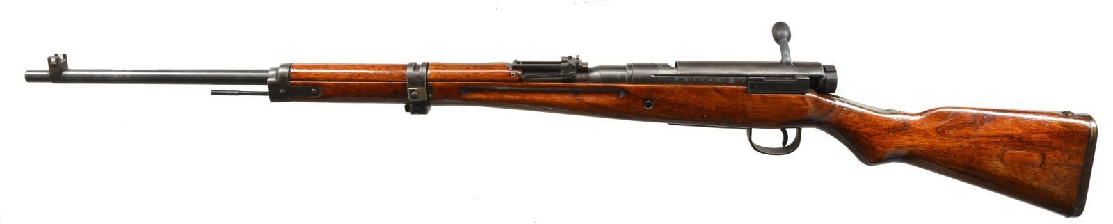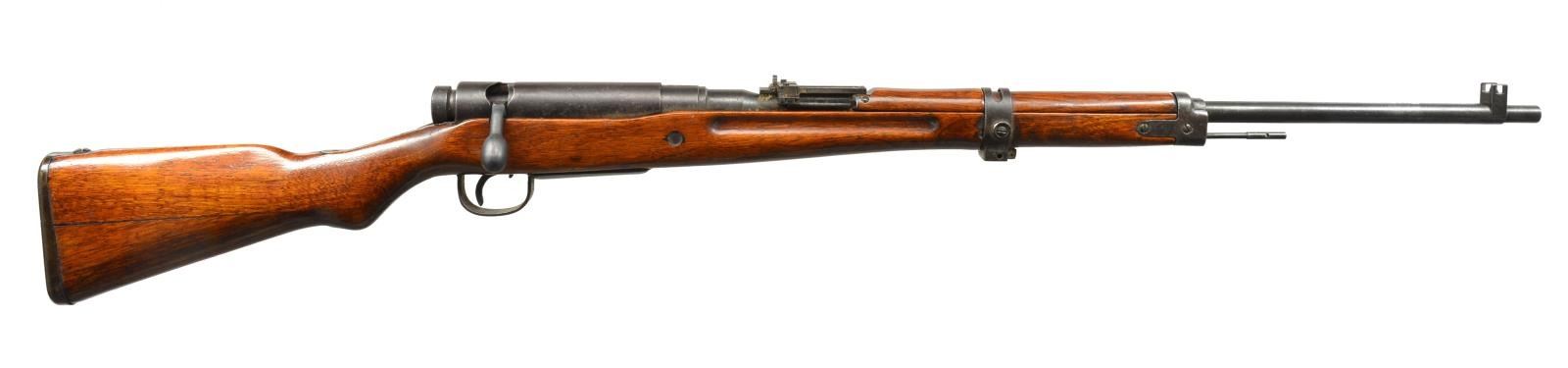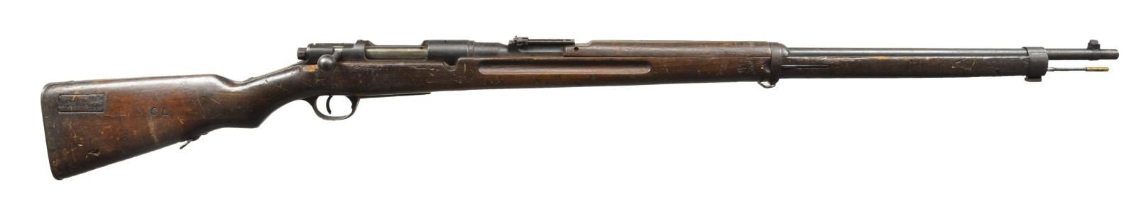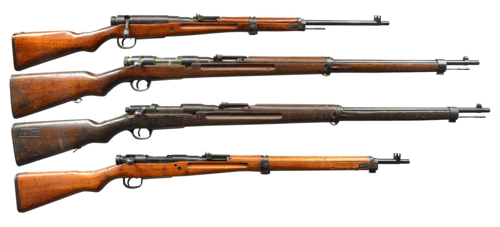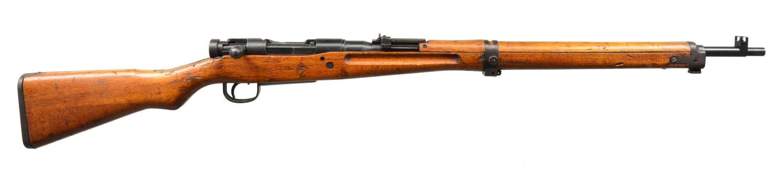 TYPES. 1) SPORTERIZED TYPE 99. Cal. 7.7 Jap. S# 22664. Bbl. 25 1/2". Numbers match on receiver, bolt & dust cover. Receiver marked w/ Kokura Arsenal markings on left rail. Intact mum & characters for “Type 99”. Bolt handle has been altered by being bent downward. Oval bolt knob. Checkered, notched safety knob. Ladder aperture rear sight graduated to 1500m w/ antiaircraft wings. Inverted V front sight w/ protective ears. Retains 4 7/8" cleaning rod. Stock & handguard has been shortened. Upper band & cleaning rod relocated, leaving approx. 10 1/8" of bbl. exposed. Bayonet lug has been removed from 2 screw upper band. Open strap lower band. Swivel base has been nearly ground away. 2 Piece stock construction w/ sm. recoil bolt & cup type buttplate. Rear swivel has wood filler in base mortise. CONDITION: stock set has been heavily sanded & given gloss finish w/ amateur gunsmith type workmanship. Metal retains 50% blue turning grey w/ wear. Good, shiny bore. (20-2212/RW). MODERN. 2) SCARCE TYPE 30. Cal. 6.5 Jap. S# 23719. Bbl. 31". Receiver is marked on left rail w/ Koshikawa Arsenal marking. Receiver ring marked on top w/ mum appearing to have a Koshikawa Arsenal mark over stamped on top. Mum is worn but legible. Receiver also has Japanese characters for “Type 30”. Straight bolt handle. Bolt made w/ separate bolt head. Safety is referred to as “hook type”. Bolt knob is much more rnd. in profile than later Type 38 rifles. Ladder rear sight graduated to 2000m. Slide locking latch is not present. Inverted V front sight. Original brass tipped 29 1/2" cleaning rod. Bottom swivels. Hardwood stock set w/ typical 2 piece Japanese construction. Marked on right side of butt w/ inverted “73” & rectangular box w/ illegible Japanese characters near heel. Flat steel buttplate. CONDITION: stock set has moderate to heavy wear w/ staining, dents, scratches & gouges throughout. Stock has notable missing chip on right side below bolt handle seat. Metal has 50% blue turning patina w/ wear, scratches, oxidation & areas of fine pitting. Trigger guard & tangs have notable patina. Poor, worn, dark bore. (20-2215/RW). CURIO. 3) TYPE 99. Cal. 7.7 Jap. S# 82309. Bbl. 25 1/2". All numbers matching except bayonet lug. Receiver is marked on left side w/ Toyo Kogyo Arsenal marking. Mum has been defaced, retains “Type 99” characters. Straight bolt handle w/ oval knob. Checkered notched safety knob. Ladder aperture rear sight graduated to 1500m w/ antiaircraft wings. Inverted V front sight w/ protective ears. Cleaning rod is not present. 3 Screw upper band. Open top lower band w/ provision for monopod which is not present. 2 Screw butt swivel. Hardwood stock set w/ long handguard. Buttstock has 2 piece construction, sm. recoil bolt & cup type buttplate. CONDITION: stock set has moderate wear, dents & scratches throughout. Hand guard has long crack extended forward from rear sight nearly to upper band. Metal has 80% blue w/ thinning, wear & sm. spots of oxidation. Good, shiny bore. (20-2225/RW). CURIO. 4) TYPE 38. Cal. 6.5 Jap. S# 1195554. Bbl. 31". Receiver is marked on left rail w/ interlocking circles for Koshikawa Arsenal. Crisp, intact mum & characters for “Type 38”. Mismatch numbers throughout. Straight bolt handle w/ oval knob. Checkered lg. tang safety knob. Ladder rear sight graduated to 2400m. Inverted V front sight. Cleaning rod is present. Hardwood stock set. Buttstock has 2 piece construction. CONDITION: stock set has moderate wear, dents, staining & scratches throughout. Notable loss of wood at toe area. Notable gouge in forend on right grasping groove. Metal retains 75% original blue finish w/ thinning & light wear. Bolt is in the white. Good shiny bore w/ lightly worn lands. (20-2226/RW). CURIO. $900-1,300.