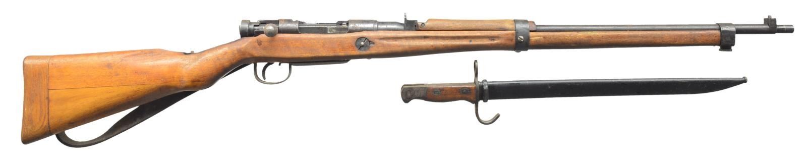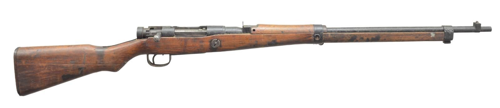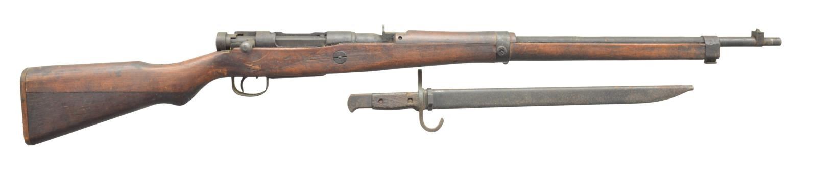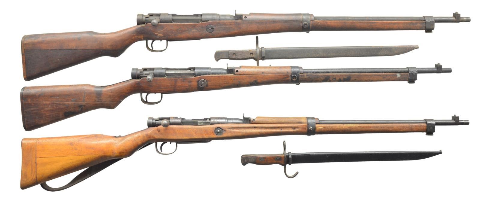 WAR FEATURES. 1) TYPE 99 KOKURA ARSENAL. Cal. 7.7 Jap. S# 54399. Bbl. 25 1/2". Receiver marked on left rail marked w/ interlocking circles denoting mfg. at Kokura Arsenal. Intact mum. Bolt has oval knob. Welded notched safety knob. Fixed aperture rear sight. Inverted V front sight. Bands have welded construction. Lg. recoil bolt. 2-Screw butt swivel. Hardwood stock set. Buttstock has 2-piece forend construction. Buttstock has added hardwood spacer, attached by 2 wood screws. Buttstock has been modified in grip area. Leather carrying strap, fashioned from US components w/ lift the dot fasteners. UNATTACHED ACCESSORIES: 15 1/8" fullered blade bayonet. Unmarked bayonet has notably less workmanship. Blade is polished, but unsharpened. Curved grip panels attached by 2 screws. Curved quillon appears to be simple stamping. Blued steel scabbard has ball tip. Bayonet blade has wear, scratches, oxidation & fine pitting w/ notably coarser machining than normal. Grips have wear, staining & several tiny cracks. Steel scabbard is blue turning patina w/ oxidation & light pitting throughout. CONDITION: stock set has wear, scratches & staining throughout. Missing chip on right side of recoil bolt. Metal has 60% blue w/ thinning, wear, oxidation & fine pitting throughout. Good, shiny bore. (20-2868/RW). 2) TYPE 99 NAGOYA ARSENAL. Cal. 7.7 Jap. S# 7056. Bbl. 25 1/2". Receiver rail marked on left side w/ Nagoya Arsenal marking. Mum has been damaged, but is still visible. Bolt has cylindrical knob & welded notched safety knob. Fixed aperture rear sight. Inverted V front sight. Welded bbl. bands. Hardwood stock set. Forend has 2-piece construction. Side swivels w/ single screw rear swivel. Lg. recoil bolt. Flat, wooden buttplate. UNATTACHED ACCESSORIES: 15 9/16" fullered blade bayonet w/ curved quilling & flat hardwood grips. Blade is marked on right ricasso w/ Jinsen Rikugun Zoheisho Arsenal marking. Steel scabbard made w/ out ball tip. Sharpened blade retains 50% blue w/ scattered spots of oxidation. Balance of metal has oxidation & fine pitting w/ traces of blue. Grips have wear, scratches & staining. Scabbard has traces of blue turning patina w/ extensive oxidation & moderate pitting. CONDITION: stock has wear, staining, dents & scratches throughout. Wooden buttplate has notable chip & crack on left side at heel. Metal has patina w/ traces of black finish w/ wear, oxidation & pitting throughout. Fair, worn looking bore. (20-2869/RW). 3) TYPE 99 NAGOYA ARSENAL. Cal. 7.7 Jap. S# 86444. Bbl. 25 1/2". Receiver marked on left side w/ Nagoya Arsenal marking. Receiver ring has been ground, removing all markings. Fixed aperture rear sight. Inverted V front sight. Numbers match on extractor & bolt. Bolt has cylindrical knob. Welded notched safety knob. Upper tang & tang screw are not present. Welded bbl. bands. Lower band has sling swivel. Hardwood stock set, forend is joined under lower band. Lg. recoil bolt. Single screw butt swivel. Flat, wooden buttplate. CONDITION: stock set has reminisces of white tape in grip area & wear, dents, scratches & staining throughout w/ appearance of having been cleaned. Metal has lg. percentage of added arsenal rework black finish w/ wear, oxidation & fine pitting throughout. Good, shiny bore. (20-2870/RW). ALL CURIOS. $400-700.