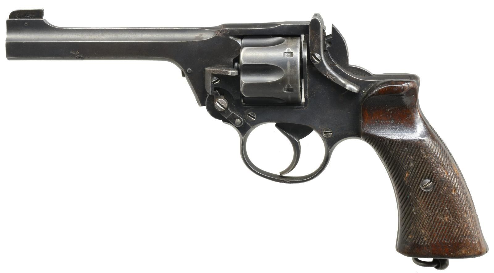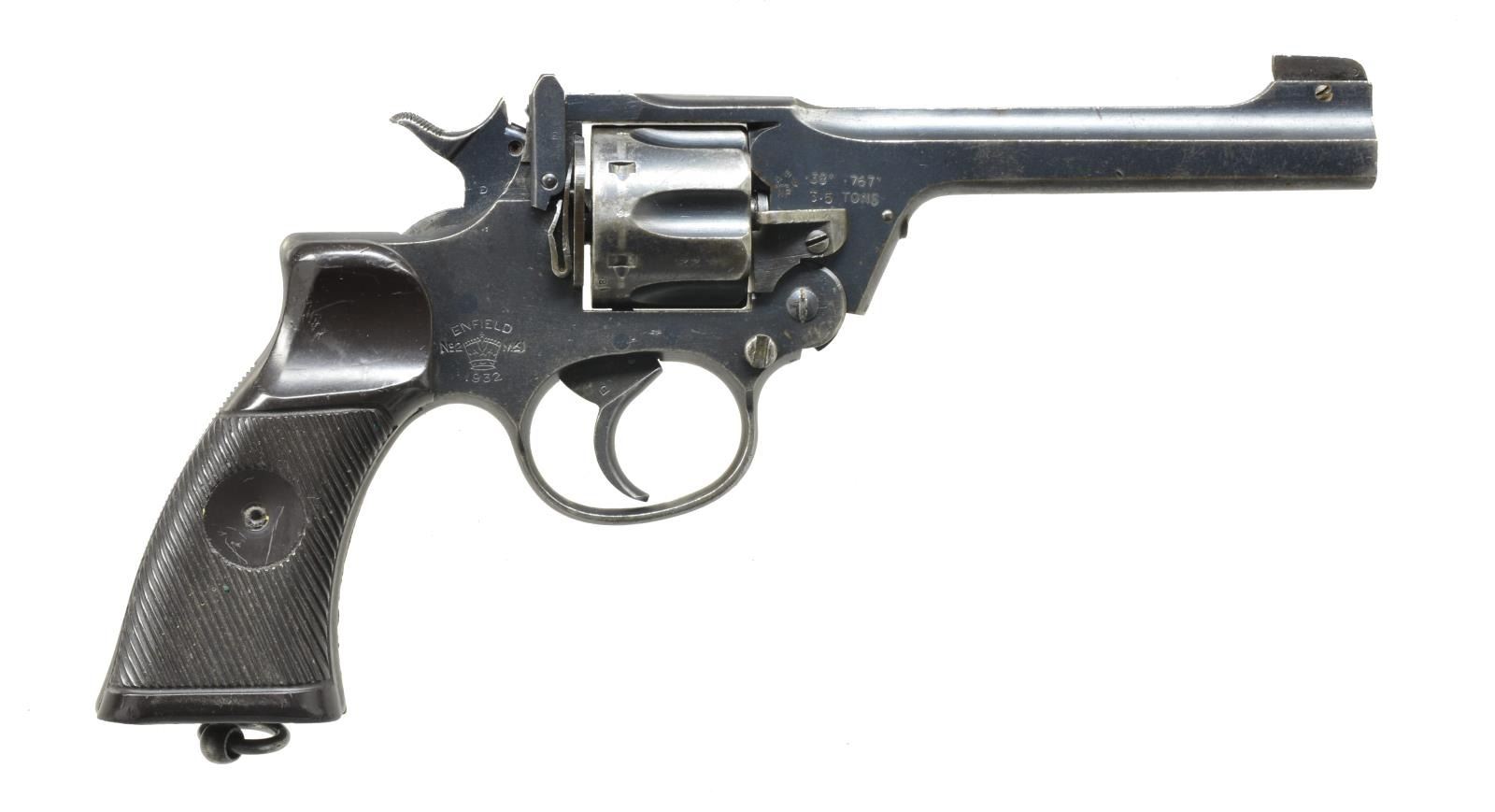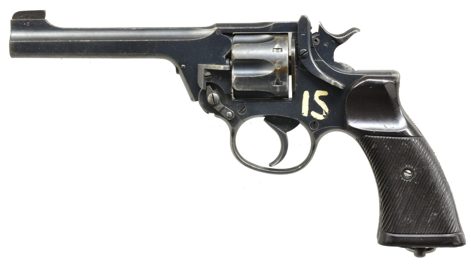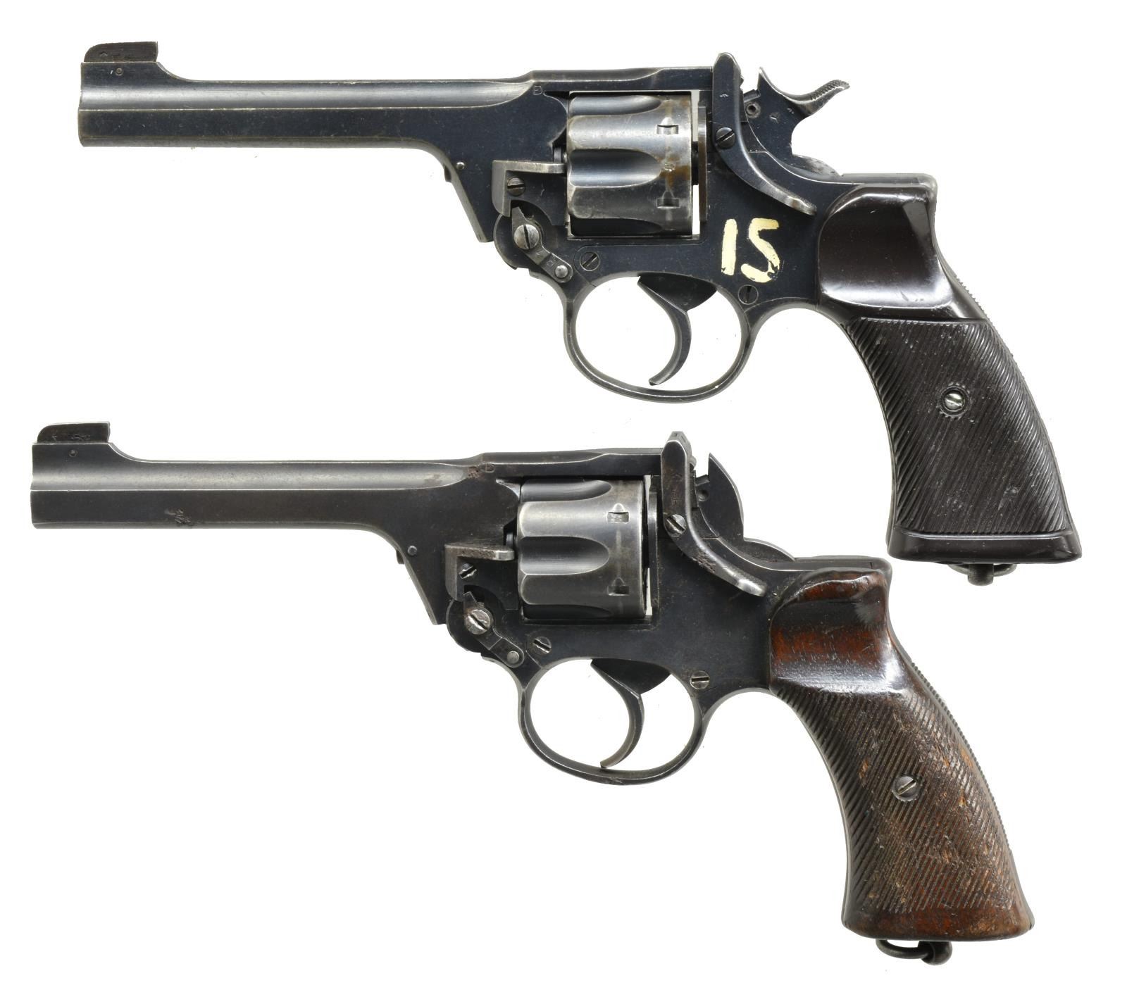 BOTH: Cal. 380/200 (38 S&W w/ 200 gr. bullet). Bbls. 5". 1) MODEL No. 2 MK 1. S# B1001. Mfg. 1932 w/ matching numbered bbl. & cyl. Butt marked "4H/309" over unreadable prior number. Grooved brown plastic grips. White painted no. 15 on left side. Standard British proofs throughout. CONDITION: good overall w/ peppery oxidation & high point wear. Grips retained w/ common stove bolt. Left grip distorted w/ midpoint depressed; especially near butt. Bbl. latch spring cracked & inoperative. Near excellent bore. (20-2154/NW). 2) MODEL No. 2 MK 1*. S# J794. Mfg. 1940 w/ matching numbered bbl. & cyl. Grooved wood grips w/ brass disk on right. Standard British proofs throughout. Modified No. 2 w/ bobbed hammer functioning DA only; often called tanker model. CONDITION: good overall w/ peppery oxidation, high point wear & occasional active oxidation spots. Grips noticeably marked & hand worn. Extractor lifts but does not snap back to closed position. Near excellent bore. (20-2155/NW). BOTH CURIO. $800-1,200.