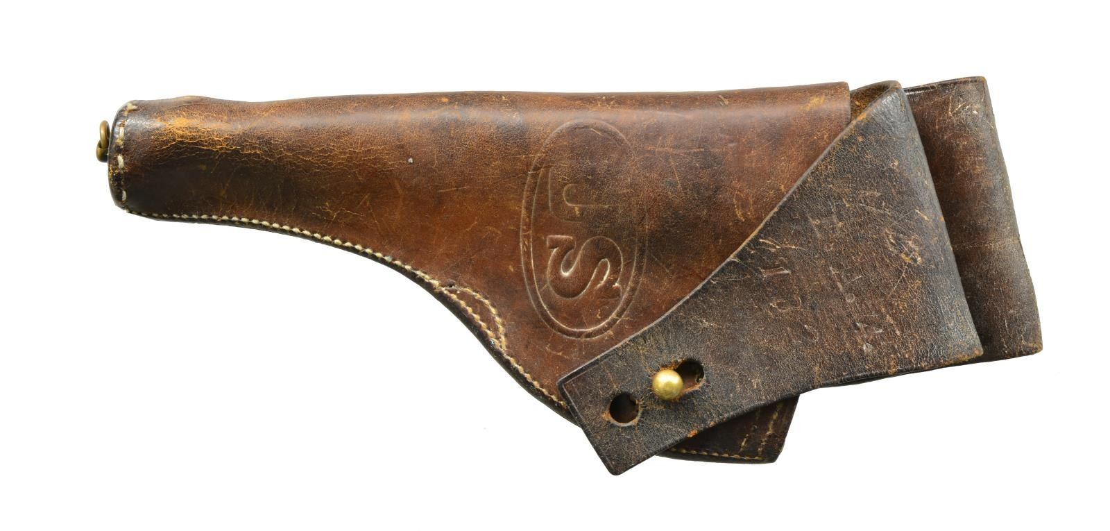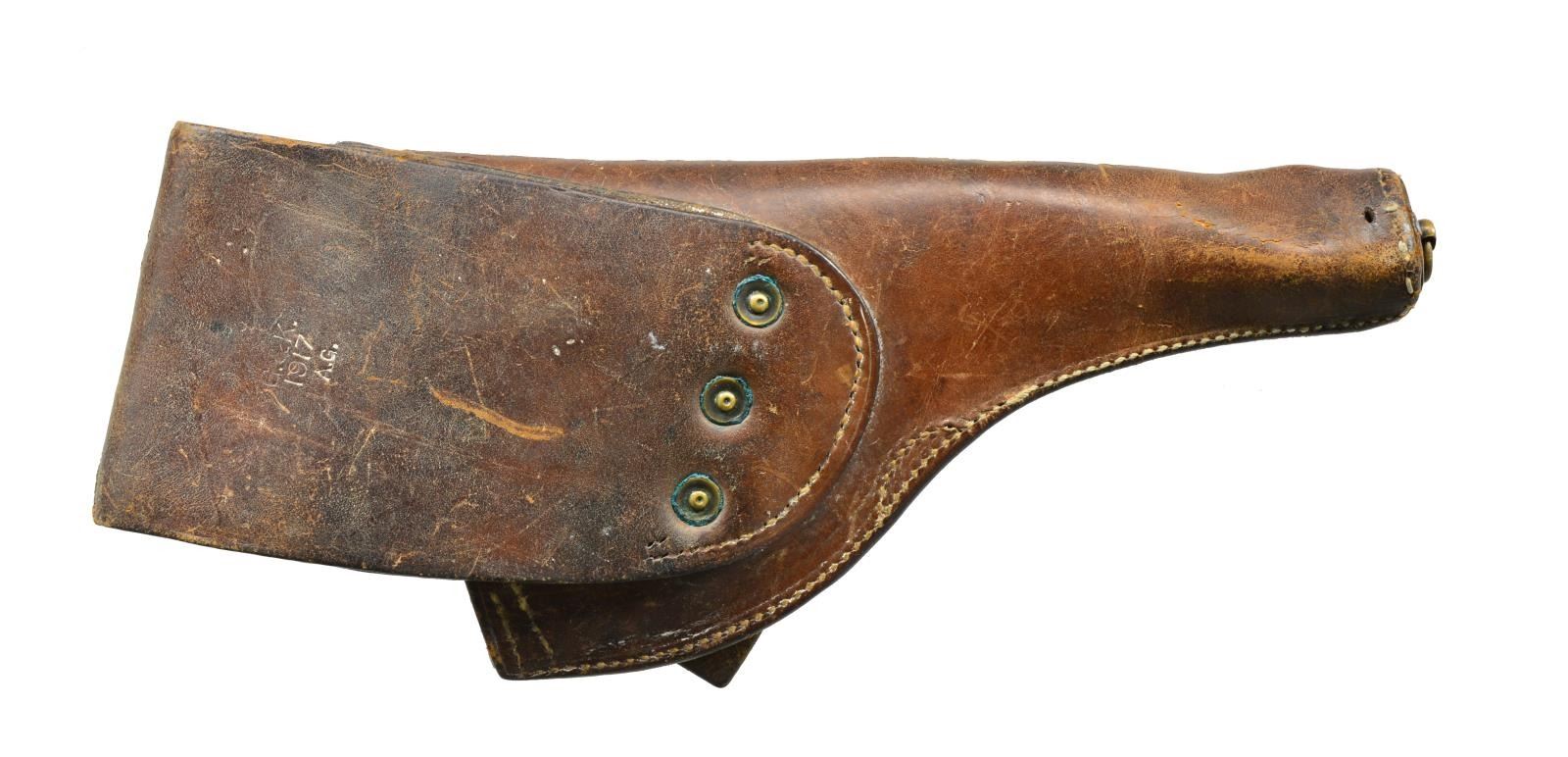 Cal. 38 S&W. S# V515353. Bbl. 5" pinned. Variation of US Victory model that was originally for US military use in 38 Spl. cal. Mfg. for British use chambered for their 38-200 cartridge which was 38 S&W w/ 200 gr. bullet. Also called Model K-200. Mfg. w/in US Victory S# range for Lend Lease program. Frame has US "P" proof. Top strap has flaming bomb followed by "U. S. PROPERTY G.H.D."; GHD is US inspector. Matching numbered cyl. & extractor; unnumbered bbl. Sand blast black magic finish. Lanyard swivel in butt. Early 5 Screw frame having standard case colored trigger & hammer. Originally w/ smooth oiled grips; presently w/ late production unnumbered checkered walnut Magna grips. Top of backstrap stamped "K90"; likely service inventory#. UNATTACHED ACCESSORIES: "G.&K. /1917 / A.G." marked US flap holster w/ "I.A.4. / 182" stamped into flap portion w/ lg. characters. Standard US in oval on front. Intended for different revolver, so added hole in strap to secure over brass stud. Capped bottom of holster w/ brass stud & lanyard ring. Good general appearance w/ typical scuffs & verdigris around brass. CONDITION: good general appearance w/ typical high point wear & occasional peppery oxidation showing mostly on trigger & backstrap. Good left grip, fair right w/ numerous marks in checkering area. Near excellent bore. (20-1849/NW). CURIO. $300-450.