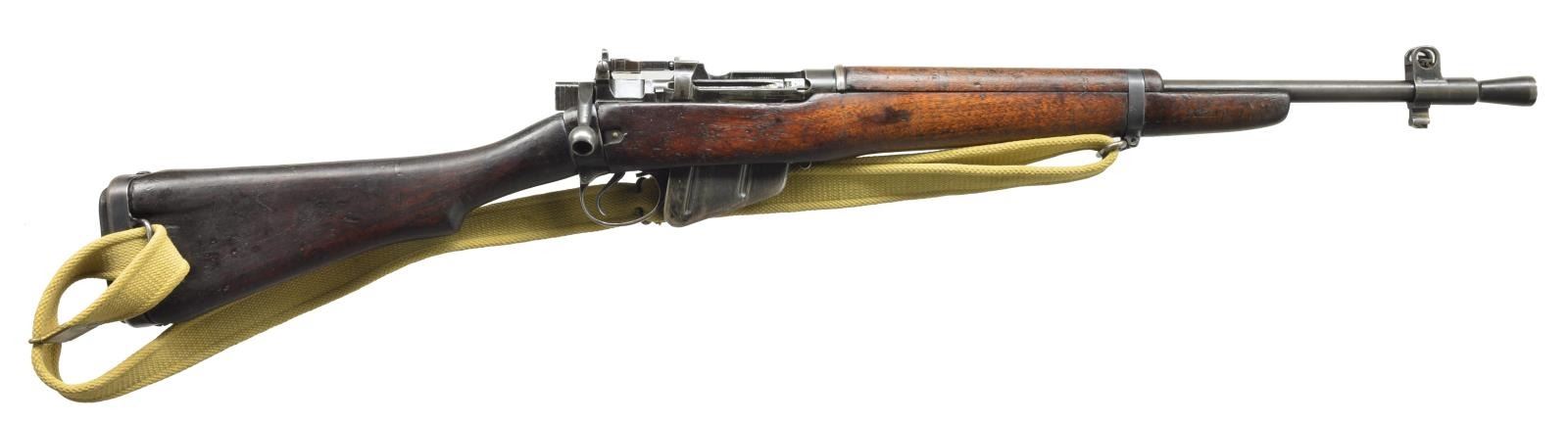 Cal. 303 Brit. S# A3712. Bbl. 20.5" over flash suppressor. Jungle carbine mfg. during WW2 to provide a lighter rifle for British troops. Rifle has correct No. 5 features, including: receiver made w/out boss on right rail which is present on standard No. 4 rifles, 2 lightning cuts on receiver beneath rear sight, hollow bolt knob & folding adj. rear sight graduated to 800yds. Blade front sight w/ protective ears is mounted on cone type flash suppressor, which includes a bayonet lug. Plunger type bolt head release. Receiver is marked on left w/ electro pencil “NO. 5 MK1 ROF (F) 8-44”, additional export marking is “MK5 303 UK”. Import mark on left side of receiver. Walnut stock set. Stock is unmarked except for rack number “24” on left side of butt in white paint. Forend has plain wood tip. Rubber buttpad & side mounted sling. Correct green web sling which is dated “1944”. MAGS: 1-10 rd. CONDITION: stock set has moderate wear, dents, staining & scratches throughout. Forend has noticeable crack extending rearward from tip to bbl. band. Metal has 50% thinning wartime finish w/ wear & scattered handling marks. Very good, shiny bore. (20-1805/RW). CURIO. $400-600.