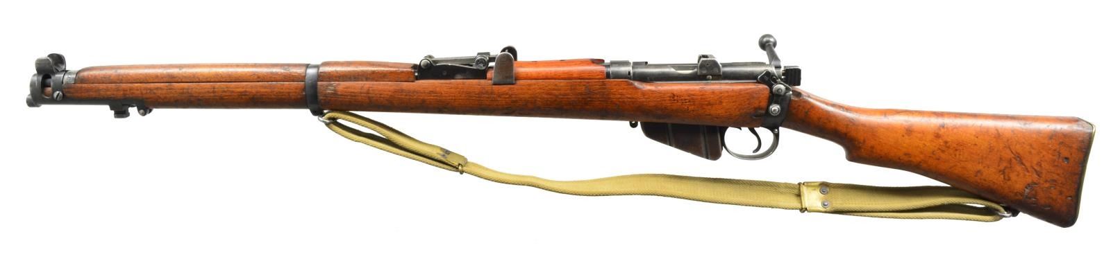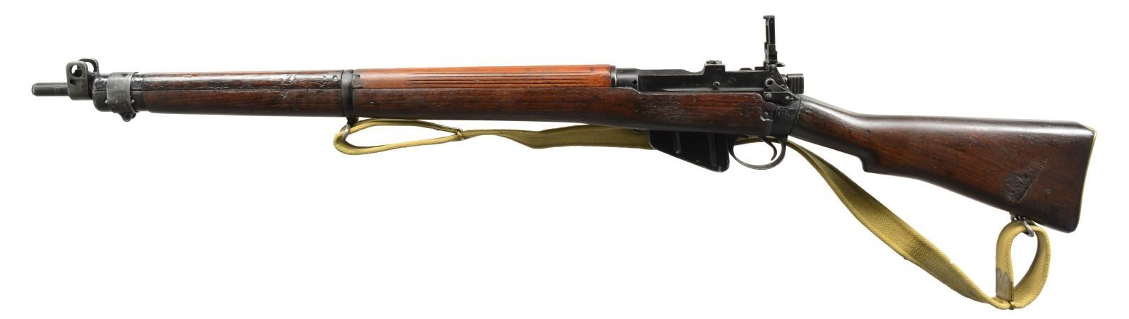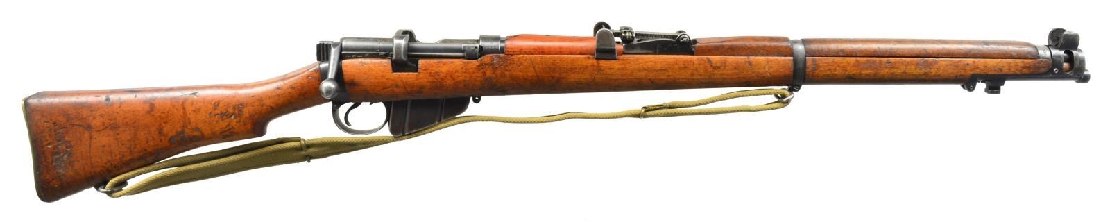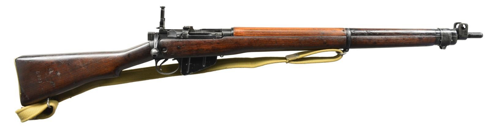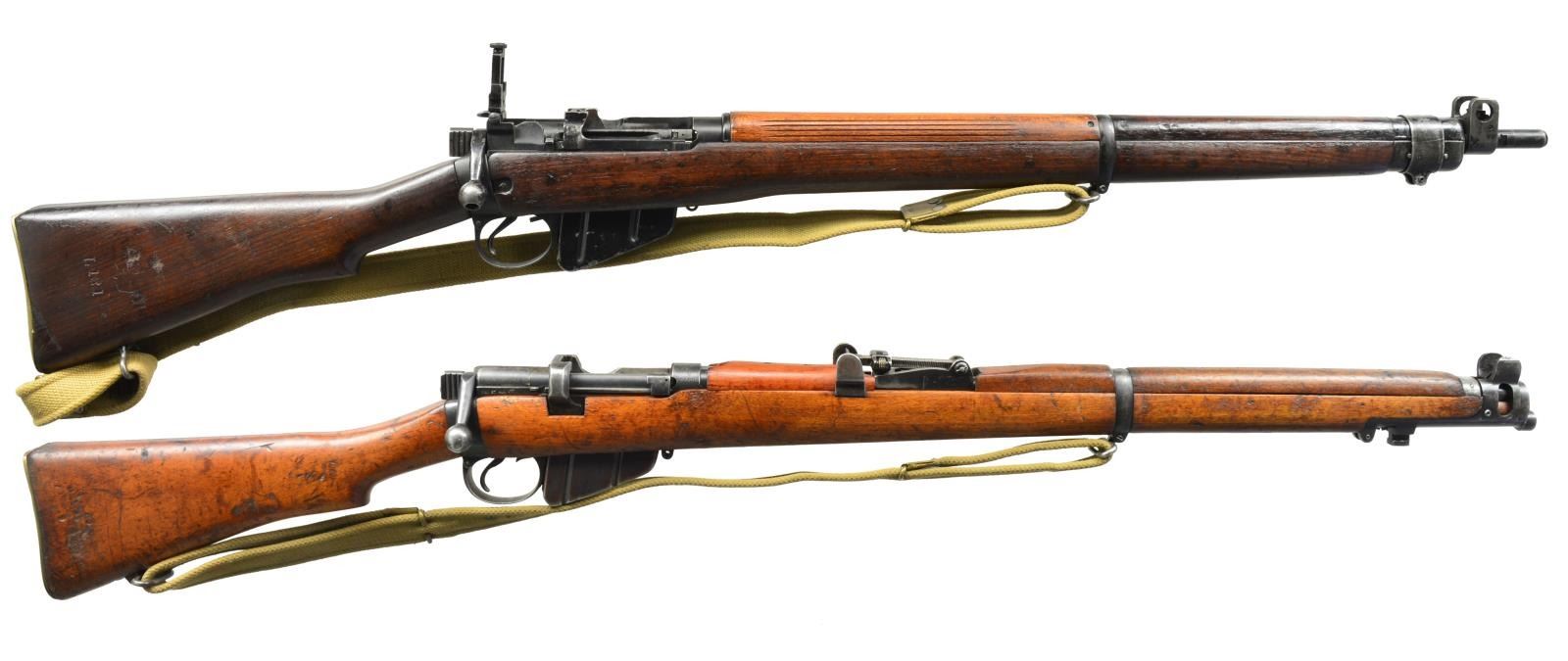 1) NO. 4 MK1 RIFLE. Cal. 303 Brit. S# D16499. Bbl. 25", 6 groove. Receiver marked on left side w/ “No. 4 MK1”, “ROF” & “FTR”. Aperture ladder rear sight marked to 1300yds. Blade front sight w/ protective ears. Import marked under bbl. Hardwood stock set. Buttstock marked on right side “L121”. Rear handguard has horizontal grooves. Green web sling. Brass trap buttplate. MAGS: 1 matching 10 rd. CONDITION: stock set has arsenal rework finish w/ moderate wear, dents, staining & scratches throughout. Notable deep dent & gouges in left side of butt. Black arsenal rework metal finish has thinning, wear & scratches throughout. Very good, shiny bore. (20-1816/RW). 2) NO.1 MK3 RIFLE. Cal. 30 Brit. S# 59960. Bbl. 25". Import marked on right side of receiver. Buttstock marked on right side w/ crown, “GR”, “1941”, “SHTLE”, “MK3” & star. Bolt has grooved cocking piece. Tangent rear sight graduated to 2000yds. Blade front sight. Nose cap w/ protective sight ears & bayonet lug. Hardwood stock set. Brass buttplate. Pull through cleaning kit in butt. Green web sling. MAGS: 1 detachable 10 rd. CONDITION: stock set has moderate wear, dents & staining throughout. Front handguard has had wood removed from both sides of front sight. Metal has 50% original finish w/ thinning, wear, turning gray. Good, shiny bore w/ lightly worn lands. (20-1818/RW). BOTH CURIO. $600-900.