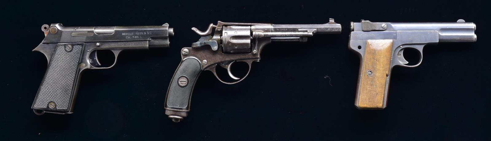 1) MAC-D 1935S M1 SEMI AUTO PISTOL. Cal. 7.65mm L. S# 1038. Bbl. 4". Fixed sights. Slide safety. Blued finish. Checkered black plastic grips. Lanyard ring. CONDITION: overall good w/ some thinning finish, high edge & muzzle wear. Grips show light wear. Frosted bore w/ lightly worn rifling. (20-3771/ZAL). 2) SWISS NAGANT REVOLVER. Cal. 7.5 Swiss. S# P26503. Bbl. 4 3/4". CONDITION: finish worn w/ old oxidation present. Chipped grips show wear. Dark bore w/ good rifling. (20-3788/ZAL). 3) SELBSTLADER SEMI AUTO PISTOL. Cal. 7.65mm. S# 66646. Bbl. 4 1/4". Blowback under barrel action. Serrated walnut grips. MAGS: NONE. CONDITION: overall fair w/ missing safety. Worn finish high edge & strap wear. Chipped grips w/ wear. Frosted bore w/ good rifling. (20-3796). ALL CURIO. $500-700.