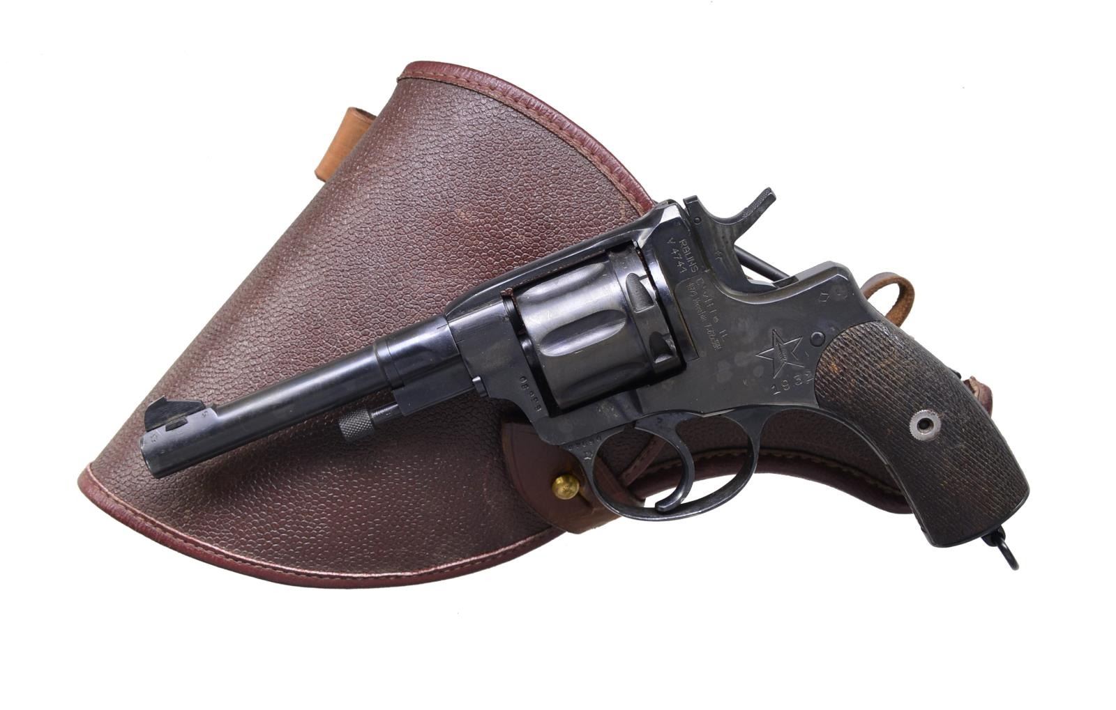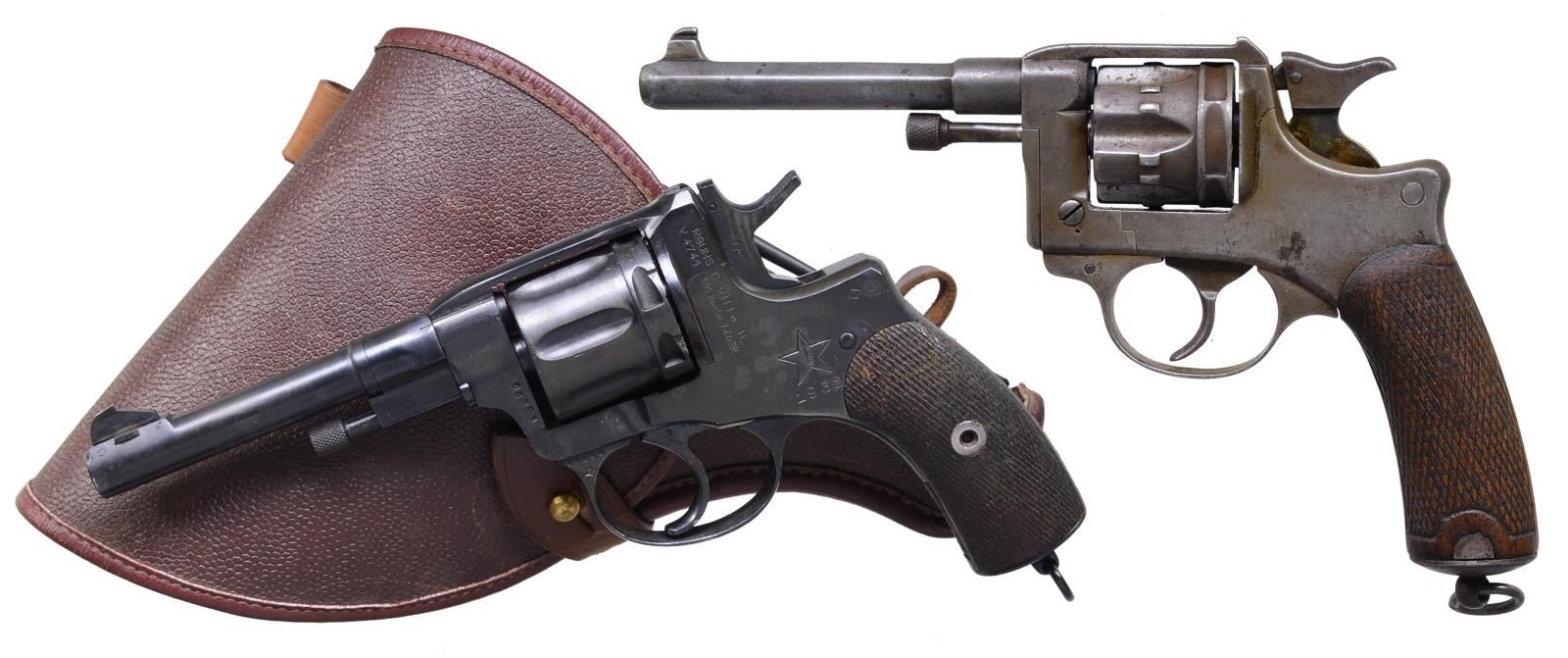 1) ST. ETIENNE MODEL 1892. Cal. 8mm. S# 1136. Bbl. 4 3/4". Introduced 1893 & used until end of WWII. Oct. bbl. w/ no visible date. Checkered walnut grip capped w/ lanyard loop. Matching numbered cyl. CONDITION: fair overall w/ no finish & appearance of gray patina. Hand worn grips. Fair bore w/ distinct rifling & cleaned light pitting. (20-3062/NW). 2) TULA ARSENAL MODEL 1895 NAGANT. Cal. 7.62 Nagant. S# V4741 (63690). Bbl. 4 1/2". Mfg. 1932 w/ matching S# 63690 on frame, trigger guard & bbl.; RGUNS import marked w/ S# V4741. Checkered walnut capped grip w/ lanyard loop. UNATTACHED ACCESSORIES: very good pebble grained flap holster w/ stud & strap retention. Front ammo pouch has double ended screwdriver blade. Cleaning rod retained on holster plus another inside having lanyard included. CONDITION: near excellent metal as refinished. Good plus grips w/ hand wear; good to very good bore w/ distinct rifling & spots of cleaned pitting. (20-3063/NW). BOTH CURIO. $350-500.