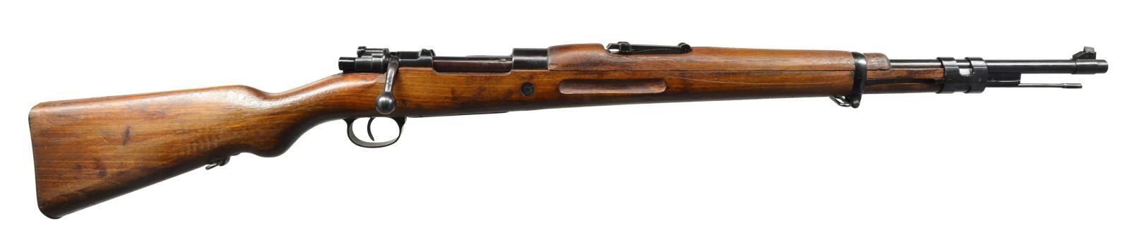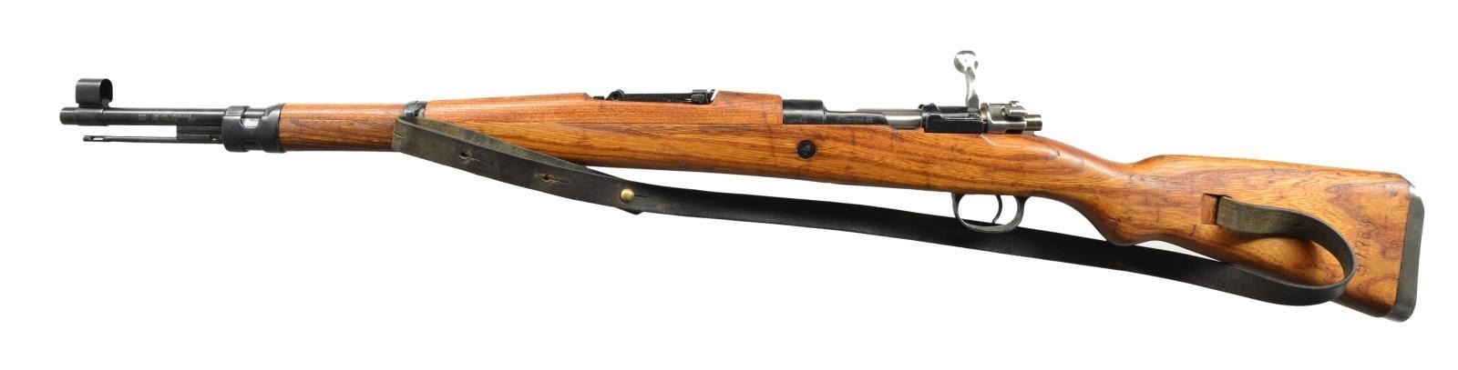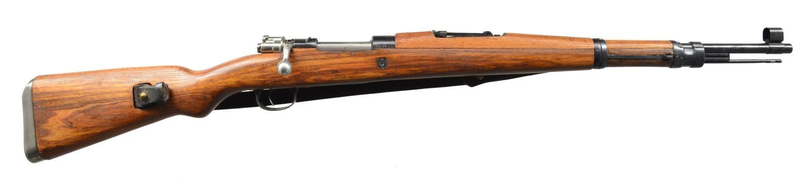 1) YUGOSLAV MODEL 48 BOLT ACTION RIFLE. Cal. 8mm Mauser. S# M47764. Bbl. 23.25". Import mark on bbl. Receiver marked on left rail w/ Cyrillic letters & “44”. Receiver ring marked on top w/ Yugoslav crest & “M48”. S# matches on receiver, bolt, floorplate & buttstock. Turned down bolt handle. Tangent rear sight graduated to 2000m. Inverted V front sight w/ protective hood. Cleaning rod is present. All milled furniture except cup type buttplate. Vintage, plain leather sling. Hardwood stock set. CONDITION: stock set has arsenal rework type finish w/ light wear, staining & handling marks. Metal has 90% arsenal rework blue finish w/ light wear & handling marks. Bolt is bright. Good shiny bore w/ light wear to lands. (20-1881/RW). 2) CZECH MAUSER BOLT ACTION RIFLE. Cal. 8mm Mauser. S# 397. Bbl. 23.75". Rifle has been given thorough arsenal overhaul. Receiver ring marked only on left side “cal. 7.92” & 2 boxed “P”s. Left receiver rail marked w/ S# “397”. Numbers match on receiver, bolt, trigger guard & floorplate. Turned down bolt handle. Tangent rear sight graduated to 2000m. Inverted V front sight. Cleaning rod is present. All milled furniture, including flat type buttplate. Provision for side & bottom sling w/ solid sling bar in left side of buttstock. Walnut stock set w/ grasping grooves. CONDITION: stock set has light wear, staining & scattered handling marks. Notable deep scratch on right side of forend. Metal has 90% blue finish, including bolt, w/ spots of missing finish, light wear & scattered scratches. Good bore w/ light wear to lands. (20-1882/RW). BOTH CURIO. $600-800.