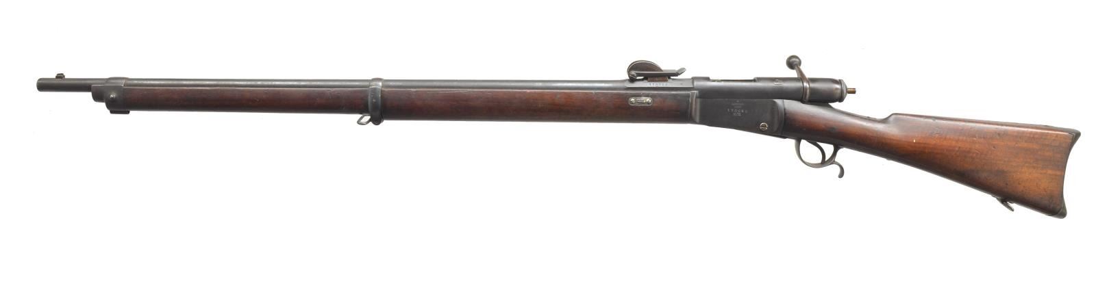 Cal. 10.4 Swiss RF. S# 170020. Bbl. 33" rd. Matching numbers. Mfg. at Waffenfabrik Bern. Strong cartouche. Good markings. CONDITION: overall good showing honest wear & handling marks. Thinning blue finish w/ light old oxidation & balanced patina. Very good stock w/ scattered scratches & dings. Frosted bore w/ good rifling. (01-18404/ZAL). ANTIQUE. $300-500.