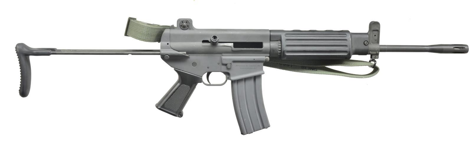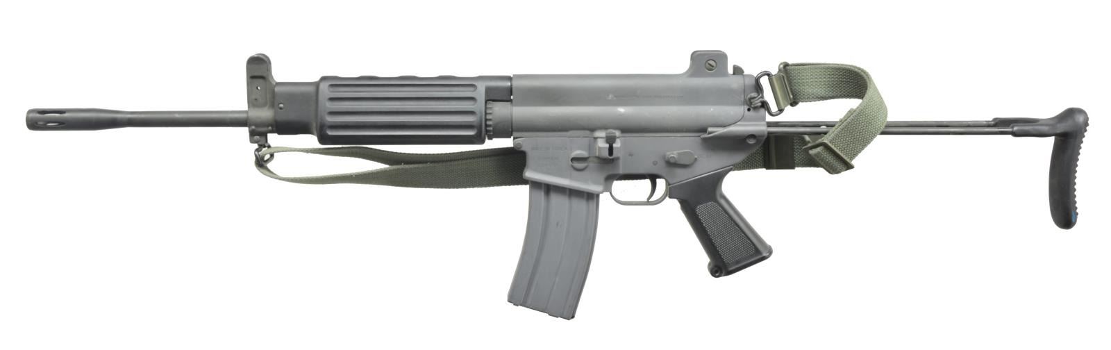 Cal. 5.56 mm. S# 018468. Bbl. 17". One of the most desirable configurations of the K1A1 rifle is the unique collapsible stock (paratrooper) version. Parkerized matte gray finish on all exposed metal surfaces. This rifle can function w/ the stock extended or collapsed w/ 4 locking positions. Sling swivel under bbl. & on left side rear receiver w/ green canvas sling. Gas operated rotating bolt system. Protected post front sight & dual aperture protected rear peep. Safety selector controls on left side. Plastic handguards & pistol grip. Integral factory muzzle brake terminates bbl. “Meat tenderizer” style rubber buttplate. Right side charging handle. The aesthetics & controls of the K1A1 are typically found favorable by those who spend time on the AR15 or M16 weapon system. MAGS: 1-30 rd. aluminum. UNATTACHED ACCESSORIES: 1 Korean issue cleaning kit including all accessories & green canvas pouch. 1 Factory shipping box. CONDITION: exterior finish exhibits light handling & storage marks. Stock locks positively in all positions. This rifle appears to have spent more time in storage than on the range. Shiny bore w/ well pronounced rifling. Fire control mechanism appears to function correctly when cycled by hand. (20-1552/JZ). MODERN. $900-1,400.