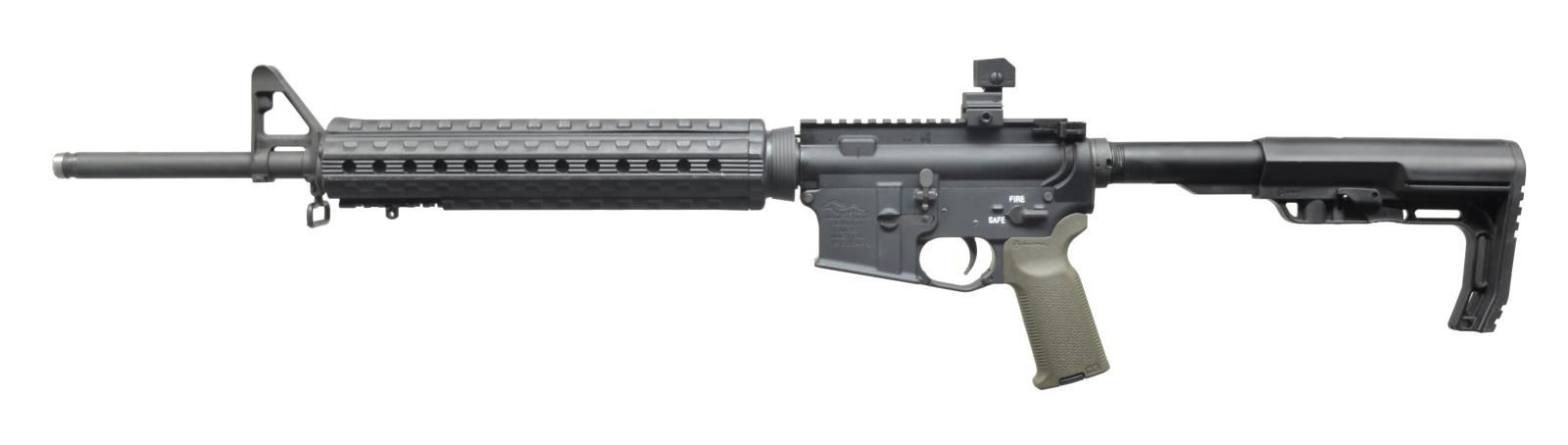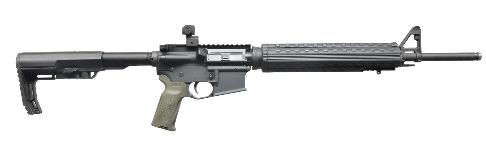 Cal. 5.56. S# 19152048. Bbl. 20". Flat top A.M. upper receiver w/ rnd. forward assist & brass deflector. Front sight protected post w/out bayo. lug. Rear sight is flip up peep adj. for elevation & windage. Hand guards are full length quad rail First Samco M44L w/ rubber rail covers. Rear stock 6 position collapsible BMS by MFT. Mag pull MOE pistol grip w/ storage compartment. Tomahawk style charging handle w/ M16 cut bolt carrier. CONDITION: complete coverage on all external metal surfaces. No major wear or blemishing. Decent bore w/ good rifling & fire control mechanism appears to function correctly when cycled by hand. (20-2520/JZ). MODERN. $500-800.