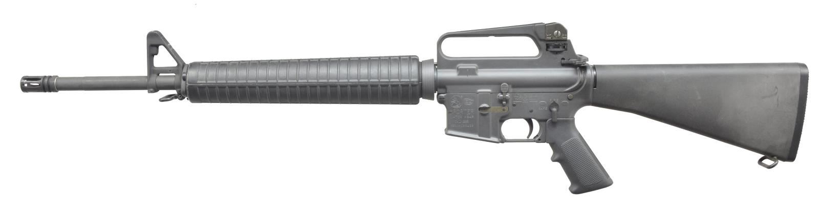 Cal. 223 Rem. S# MH066429. Model R6601. Bbl. 20" marked "CMP 5.56 NATO 1/7 HBAR". A2 Style flash hider. Elevation adj. traditional protected post front sight. Adj. dual aperture rear sight on upper receiver carry handle. Rnd. A2 style handguards w/ tapered delta ring. Slab side lower receiver w/ rnd. forward assist & brass deflector. 10 1/2" A2 trapdoor rear stock. Bottom front & rear sling swivels. Parkerized finish. MAGS: 2 Colt marked 20 rd. UNATTACHED ACCESSORIES: original blue label box containing instruction manual, web sling, & cleaning brushes. CONDITION: near excellent retaining over 99% finish. Bright near excellent bore. (20-2415/DS). MODERN. $1,500-2,000.