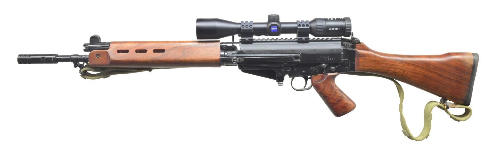Cal. 7.62MM. S# SA-2691. Bbl. 19" over muzzle brake. Springfield Armory SAR-48 built on a Brazilian Imbel receiver. Adj. gas system. Protected post front sight. Elevation adj. rear sight. After market top cover w/ 8.5" picatinny rail section. Carl Zeiss 3-9x40 Conquest scope w/ duplex reticle. Left side non-reciprocating charging handle. Carry handle. Metric pattern receiver. Sling swivels front & rear. Green canvas sling. Markings on left side includes “SAR-48 / 7.62mm SA-2691”. Markings on right side includes “SPRINGFIELD ARMORY, GENESEO, IL. USA”, Springfield Armory crossed cannons & “1005-SA-48-MATCH”. Hardwood furniture. CONDITION: shiny bore w/ good rifling. Wood furniture free of any structural imperfections, only exhibiting normal light impressions & thinning finish toward rear of buttstock. All exterior metal surfaces, other than replacement top cover which is matte finished, are dark black. Fire control mechanism appears to function correctly when cycled by hand. (20-3055/JZ). MODERN. $900-1,200.