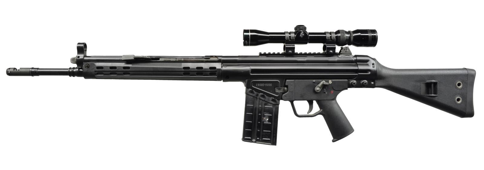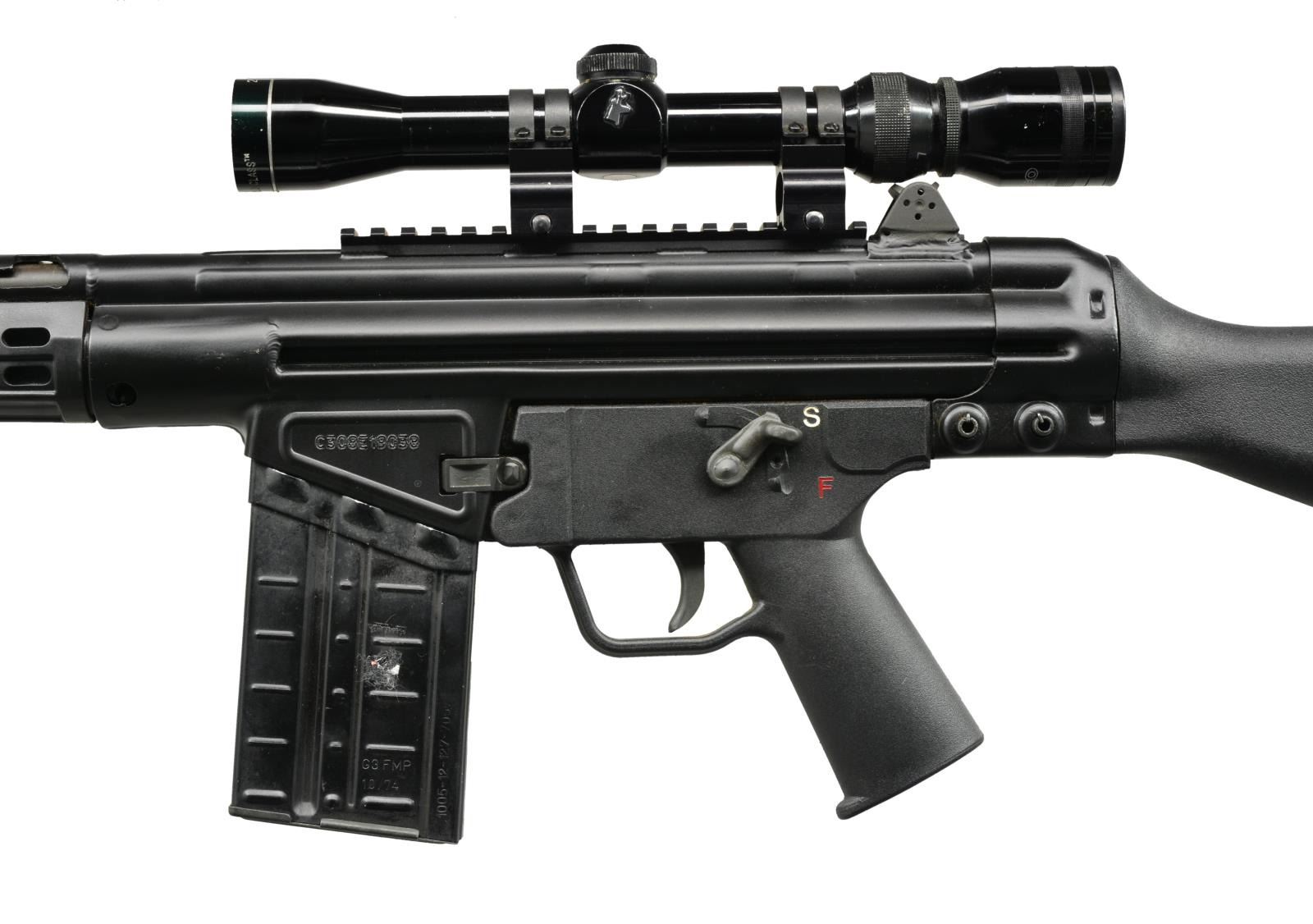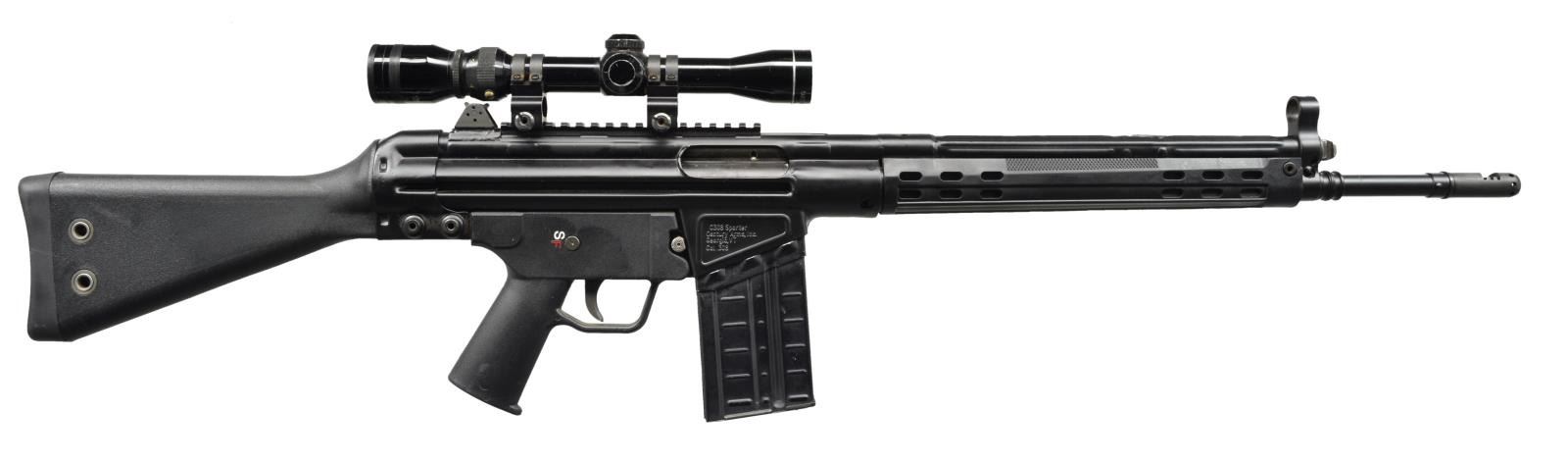 Cal. 308. S# C308E19038. Bbl. 19.5” over muzzle break. A very clean Century variant of the popular HK 91, Roller Locked 308 rifle. Folded metal receiver w/ 7” picatinny rail welded on the top rib for ease of optic mounting. Hooded front post sight w/ 4 position rear peep sight (not factory HK drum). Black painted finish, slim line jungle fore end, full length plastic rear stock, plastic “SF” trigger pack, aftermarket flash hider/muzzle break, push button mag. release. Tasco 2-7x32 world class scope. MAGAZINES: 1 aluminum 20 rd. mag. CONDITION: this is possibly one of the cleanest Century 308 rifles we have ever handled; finish is largely unblemished w/ complete uniform coverage on all exposed metal surfaces, plastic furniture is also very good w/ only very light handling wear, shiny bore w/ well pronounced rifling, fire control mechanism appears to function correctly when cycled by hand. (20-830/JZ). MODERN. $400-600.