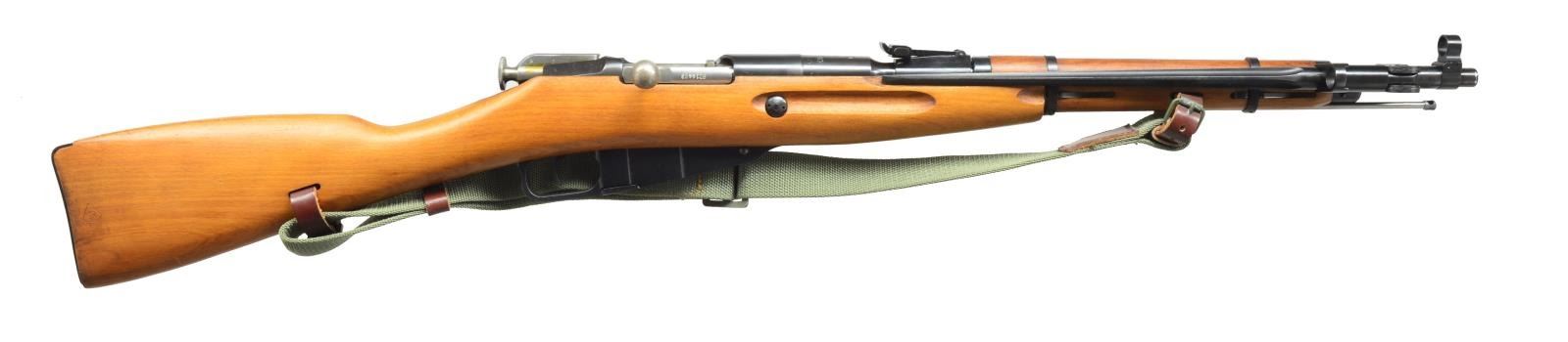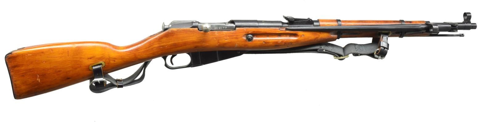 BAYONETS. ALL: bbls. 20 1/4". 1) POLISH M44. Cal. 7.62x54R. S# BD14463. All visible numbers match. Straight bolt handle. Round receiver unmarked. Bbl. marked over chamber w/ "11" in oval & "1952". Tangent rear sight graduated to 1000m. Hooded post front sight. Cleaning rod is present. 12" Folding spike bayonet. Hardwood stock set. Green web sling. CONDITION: carbine has near excellent original finish on both wood & metal. Near excellent shiny bore. (20-3587/RW). CURIO. 2) RUSSIAN M44. Cal. 7.62x54R. S# 002270. All visible numbers match. Rnd. receiver import marked on left side. Russian markings over chamber include arrow inside diamond indicating mfg. at Izhevsk Arsenal & hammer & sickle in wreath. Straight bolt handle. Tangent rear sight graduated to 1000m. Hooded post front sight. Cleaning rod is present. 12 1/4" Folding spike bayonet. Hardwood stock set. Green web sling w/ leather collars. CONDITION: stock set has arsenal rework finish w/ light wear, scattered handling & flaking finish. Toe has large repair. Metal has 90% arsenal rework finish w/ light wear. Very good shiny bore. (20-3619/RW). CURIO. 3) M44 CARBINE. Cal. 7.62x54R. S# G9293. Straight bolt handle. Rnd. receiver. Markings have been removed from area over chamber, leaving S#. Tangent rear sight graduated to 1000m. Post front sight w/ protective hood. 12 1/4" Folding spike bayonet. Cleaning rod is not present. Hardwood stock set. CONDITION: stock set has brown painted arsenal rework finish w/ wear, dents & scratches. Metal has arsenal rework finish w/ scattered oxidation & fine pitting throughout. Poor dark oxidized bore. (20-3620/RW). CURIO. 4) M44 CARBINE. Cal. 7.62x54R. S# W11251. Import marked on left side of rnd. receiver. Original S# matches on bbl., bolt, mag. & buttplate. Straight bolt handle. Bbl. marked over chamber "diamond" Izhevsk marking & hammer & sickle in wreath. Tangent rear sight graduated to 1000m. Post front sight w/ protective hood. Cleaning rod is present. 12 1/8" Folding spike bayonet. Hardwood stock set. Gray web sling w/ leather collars. CONDITION: arsenal rework stock set has thinning, flaking finish & scattered handling marks. Arsenal rework metal finish has light wear & spots of missing finish. Poor worn bore turning dark. (20-3621/RW). CURIO. $350-550.