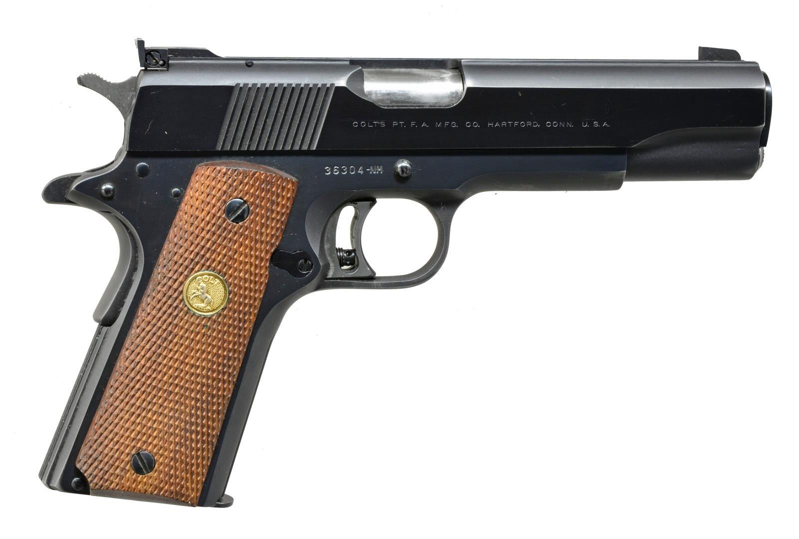 Cal. 45 ACP. S# 36304-NM. Bbl. 5". Patridge front sight w/ Elliason square notch adj. rear sight. Long trigger w/ adj. over travel stop & lg. ejection port. Blue finish. 2 Piece checkered walnut grip w/ Rampant Colt medallions. 1970 Mfg. MAGS: 1 detachable 7 rd. CONDITION: over 90% original blue showing edge & carry wear. Grips show light wear. Bright bore w/ sharp rifling. (20-3228/DS). MODERN. $1,500-2,000.