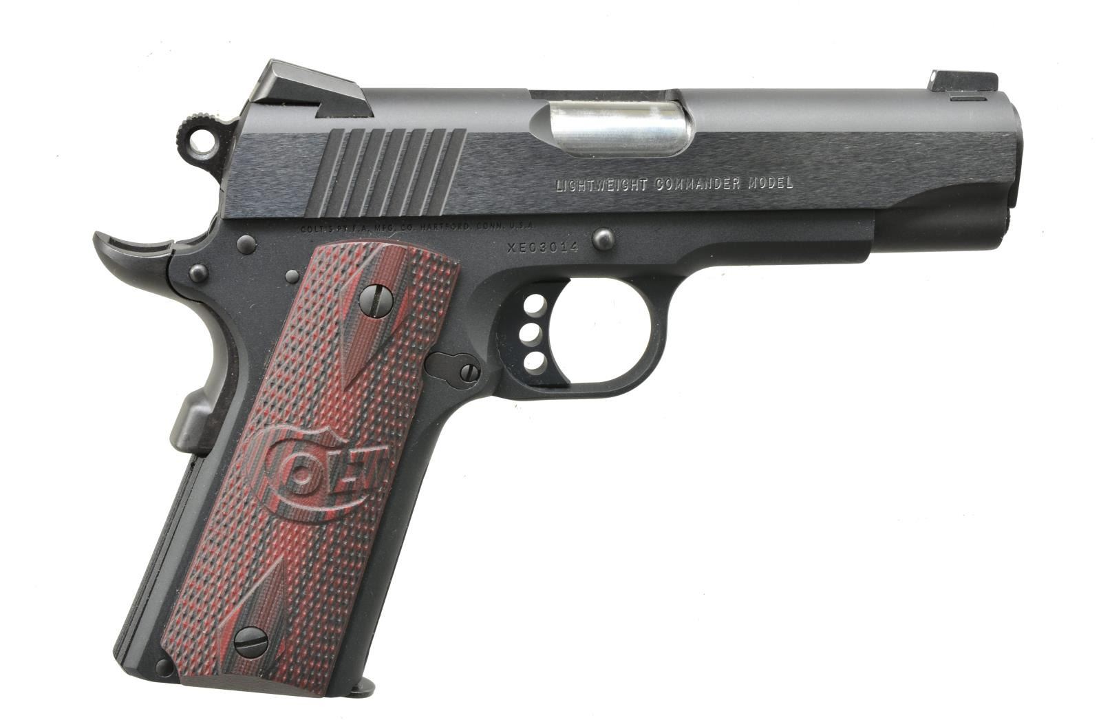 Cal. 45 ACP. S# XE03014. Bbl. 4 1/4". Steel slide w/ matted top & 3 dot sights. Black finished alloy frame. Competition hammer & trigger w/ beavertail grip safety. 2 Piece checkered maroon & black synthetic grips. MAGS: 2 detachable 8 rd. CONDITION: 99% metal finish. Very good grips. Bore retains strong rifling. (20-3215/DS). MODERN. $1,000-1,500.