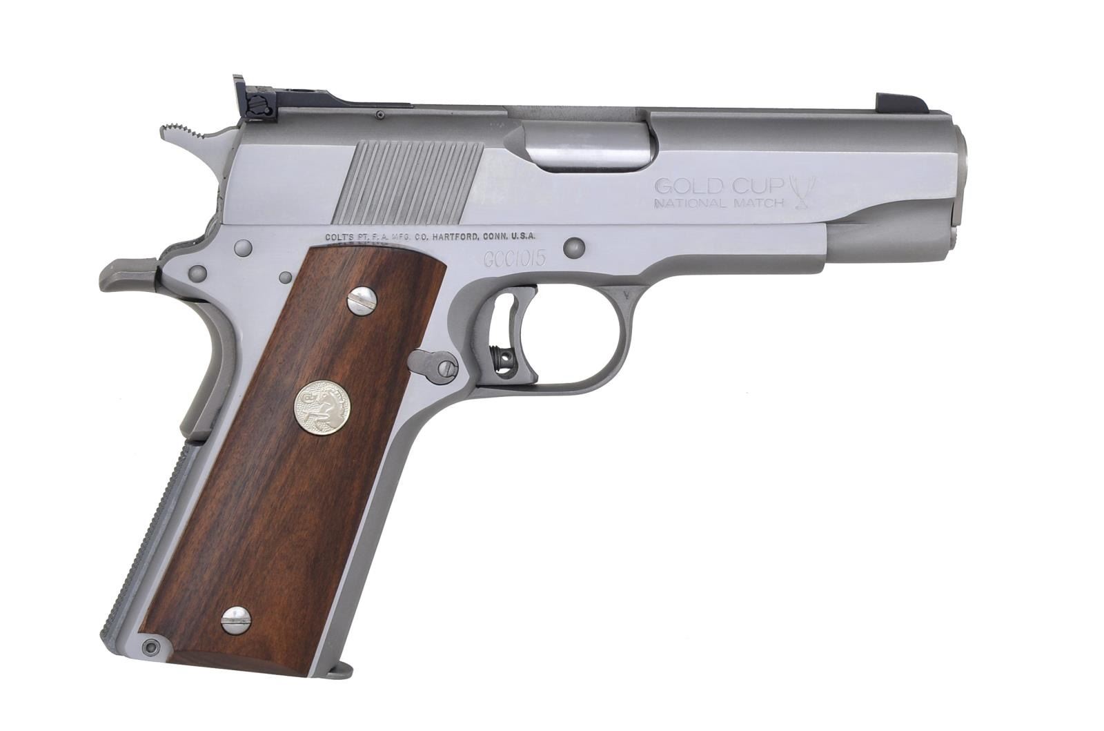 EDITION SEMI AUTO PISTOL. Cal. 45 ACP. S# GCC1015. Bbl. 4 1/4" National Match. Patridge front sight w/ Elliason square notch adj. rear sight. Stainless steel construction. Target trigger. 2 Piece smooth walnut grips w/ Rampant Colt medallions. MAGS: 2 detachable 7 rd. UNATTACHED ACCESSORIES: blue molded box w/ decorative cover containing instruction manual, the Colt Companion brochure, service center pamphlet & congratulations letter. CONDITION: as new in box. (20-3110/DS). MODERN. $800-1,100.