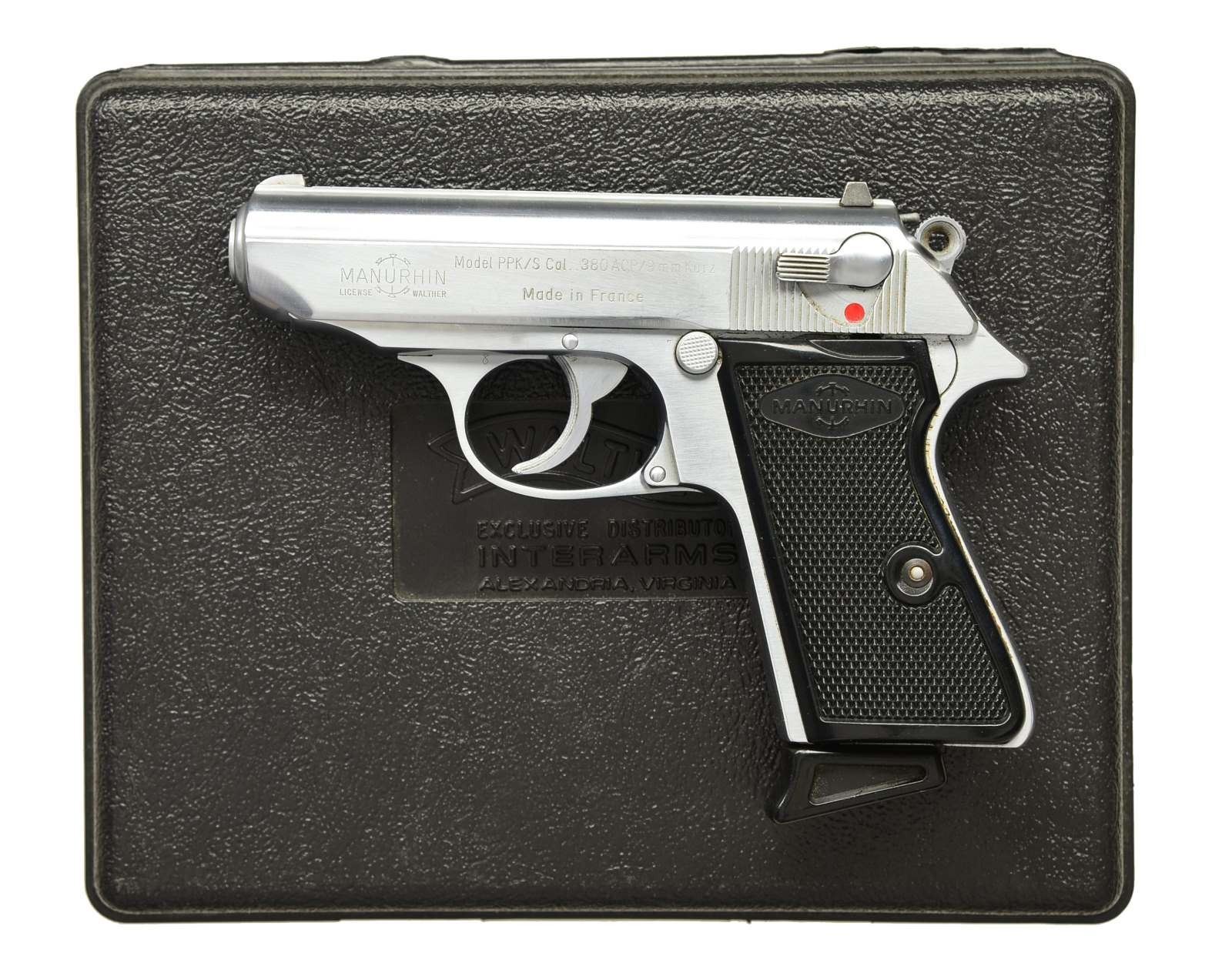 Cal. 380 ACP. S# 265424S. Bbl. 3 1/2". Mfg. in France under license from Walther & Imported by Manurhin International. Stainless finish w/ blued rear sight. Black checkered Manurhin plastic grips. MAGS: 2- 8 rd Walther Banner. UNATTACHED ACCESSORIES: unlabeled black Walther Interarms plastic molded box. CONDITION: all aspects are very good plus w/ only a few minor handling marks. Very good bore w/ good rifling. (20-3241/ZAL). CURIO. $400-600.
