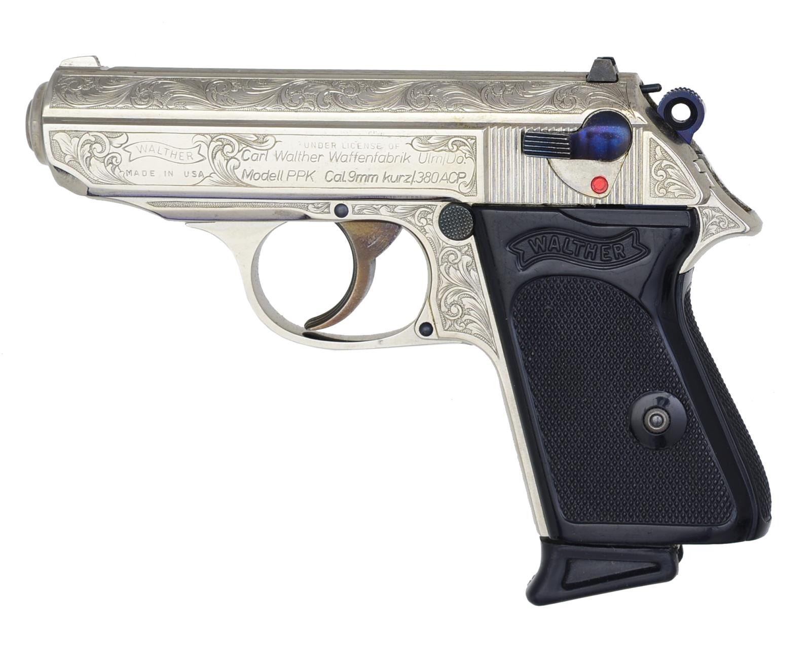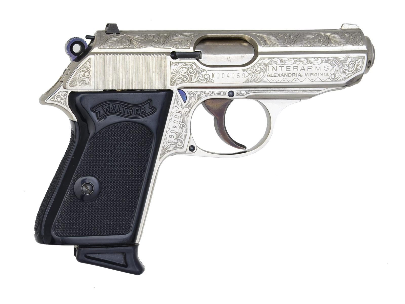 Cal. 380 ACP. S# K004069. Bbl. 3 1/4". Nickel finished w/ fire blued trigger, rear sight, mag. release & safety lever. Vine type foliate scroll engraving w/ punch dot background that continues to grip straps & trigger guard bow. 2 Piece checkered plastic Walther marked grips. Slide is marked "INTERARMS / ALEXANDRIA, VIRGINIA" & "MADE IN USA". MAGS: 1 detachable 8 rd. w/ finger extension. UNATTACHED ACCESSORIES: 2 piece laminate aftermarket grips. CONDITION: 98% nickel finish. Grips show light wear. Bore retains sound rifling showing some darkness in grooves. (20-3824/DS). MODERN. $500-700.