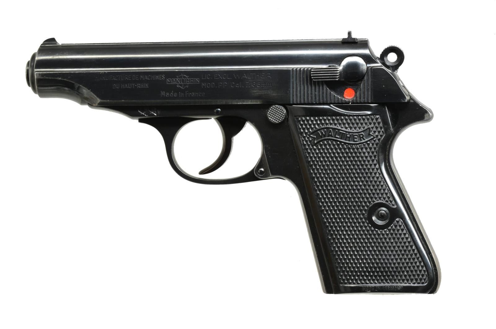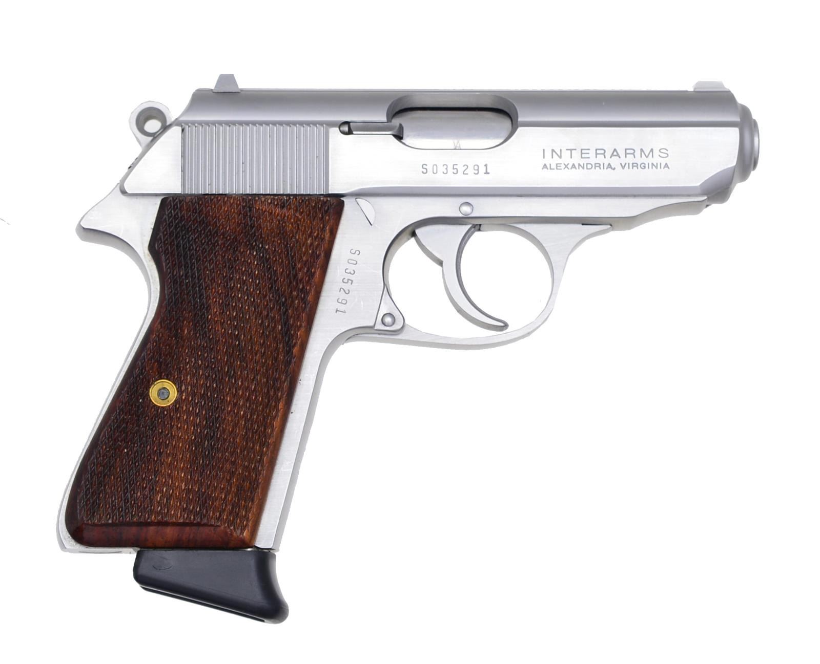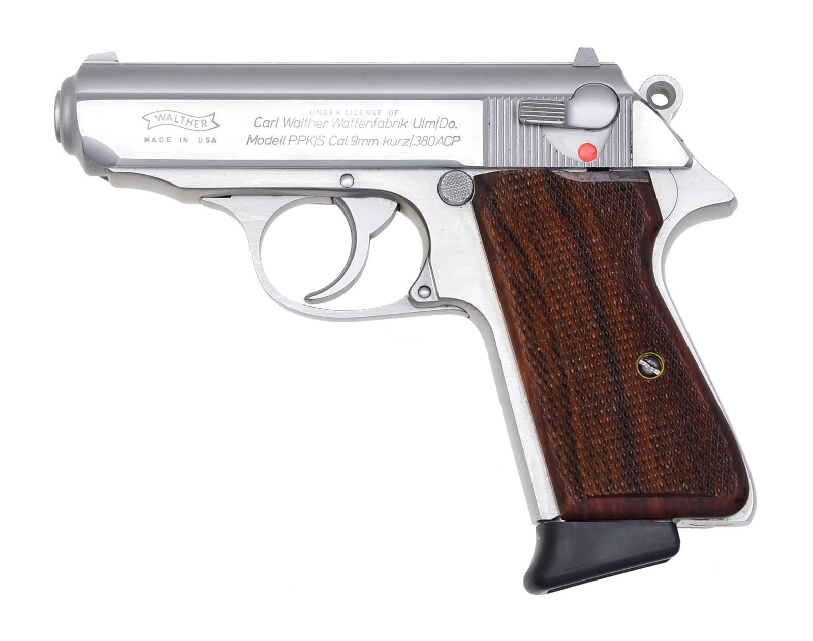 1) PPK/S. Cal. 380 ACP (9MM Kurz). S# S035291. Bbl. 3 1/4”. Stainless finish. Fixed sights. Coco bolo grips. Made in USA under license from Walther. MAGS: 1-7 rd aftermarket w/ finger extension. CONDITION: overall near excellent w/ some scattered faint scratches. Very good grips. Near excellent bore w/ nice rifling. (20-3822/ZAL). 2) MANUHRIN PP. Cal. 7.65mm. S# 47123. Bbl. 3 3/4”. Blued finish. Fixed sights. Checkered black plastic grips. Made in France under license from Walther. Imported by HK. MAGS: 1 Walther banner marked pp 7.65mm. CONDITION: overall very good w/ some light high edge & muzzle wear plus scattered light handling marks. X’d out frame marking. Very good bore w/ strong rifling. (20-3828/ZAL). BOTH MODERN. $600-1,000.