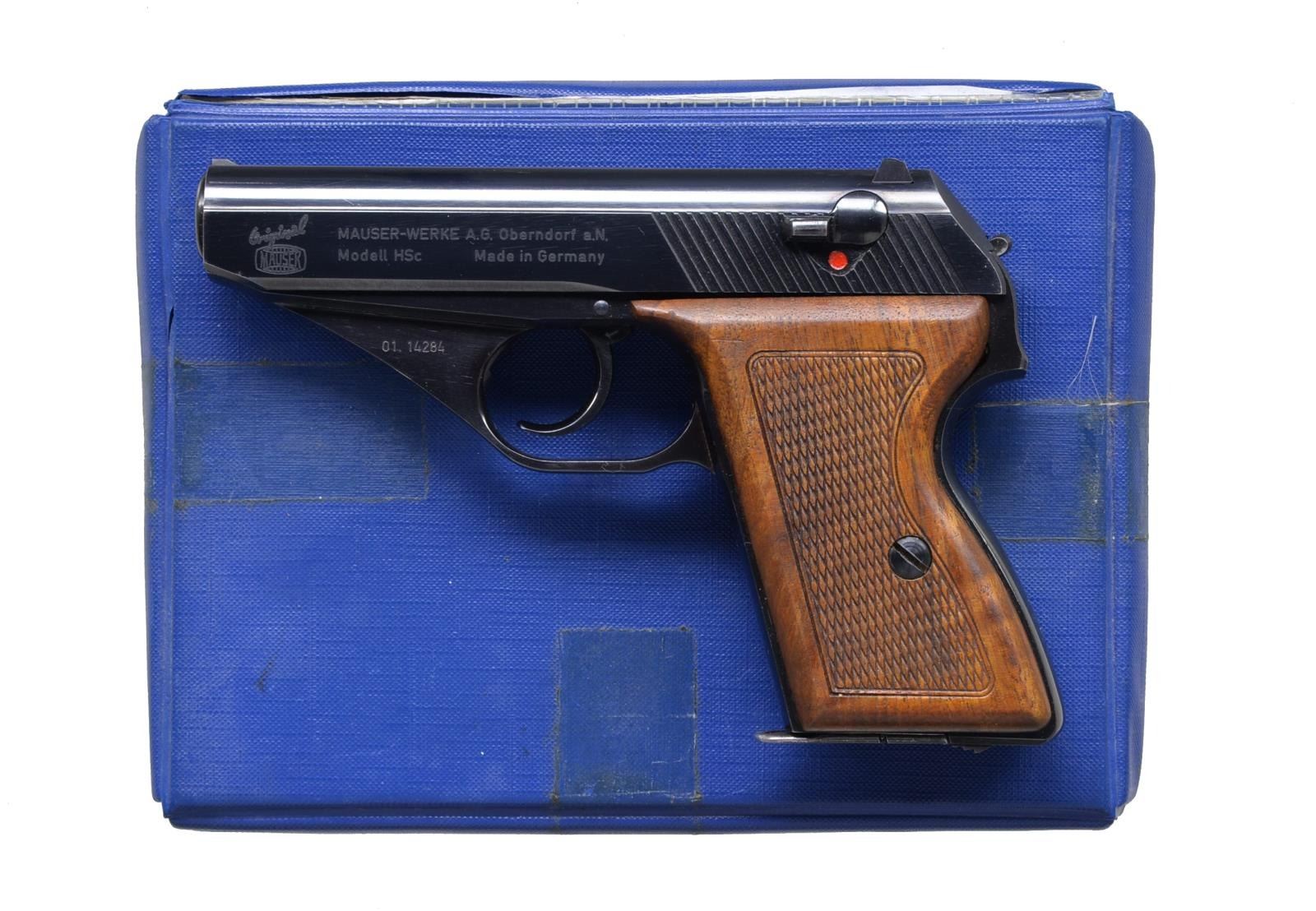 Cal. 380. S# 01.14284. Bbl. 3 3/4". Top is a matted trough w/ sm. blade front sight & fixed rear sight. Checkered walnut stocks. Left side of slide is marked “ORIGINAL MAUSER / MAUSER-WERKS A. G. OBERNDORF a. N. MODEL HSC MADE IN GERMANY”. Right side is marked “DISTRIBUTED BY INTER ARMS ALEXANDRIA, VIRGINIA, U.S.A.”. Slide & frame have matching numbers. MAGS: 1 flat bottom mag. UNATTACHED ACCESSORIES: original box w/ paperwork. Lid is detached from box. CONDITION: grips contain most of their original finish w/ good checkering. Slide retains most of its original blue w/ faint wear on sharp edges. Frame retains most of its original blue w/ minor scratches. Bore is bright & shiny. (20-3178/BT). MODERN. $400-550.