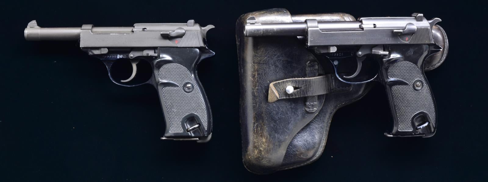 1) WALTHER P38. Cal. 9mm. S# 066659. Bbl. 5". PW Arms imported; German made Walther P38. Drift adj. sights, front & rear. Serrated slide. Parkerized finish on exposed metal surfaces. Traditional dbl. action w/ left hand safety/decocker. Black plastic grips. Bottom mag. release w/ left side lanyard loop. MAGS: 1 - 8 rd. Walther factory mag. CONDITION: metal finish on exposed surfaces is quite complete, though has several light scratches as typically caused by armory type handling. Right side engraved “GERMANY / PW ARMS REDMOND WA Shiny bore w/ well pronounced rifling. Fire control mechanism appears to function correctly when cycled by hand. (20-4130/JZ). 2) MANURHIN P1. Cal. 9mm. S# 225825. Bbl. 5". French mfg. P1, which is a postwar variant of the German P38. Parkerized finish on exposed metal surfaces. Traditional dbl. action w/ left hand safety/decocker. Black plastic grips. Bottom mag. release w/ left side lanyard loop. MAGS: 1 - 8 rd. factory mag. UNATTACHED ACCESSORIES: Belgian made black leather holster. CONDITION: finish on exposed metal surfaces are fairly complete throughout w/ a thinner slide finish & heavier on bbl. Bbl. has area of thinning at 9 o’clock position from the muzzle approx. 1 1/2” in. Shiny bore w/ well pronounced rifling. Fire control mechanism appears to function correctly when cycled by hand. (20-4131/JZ). BOTH MODERN. $400-800.