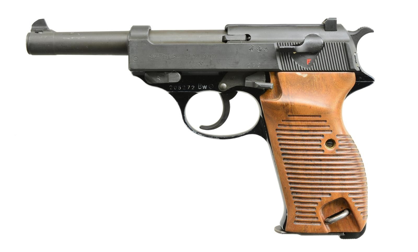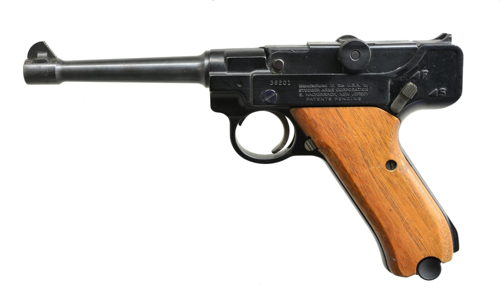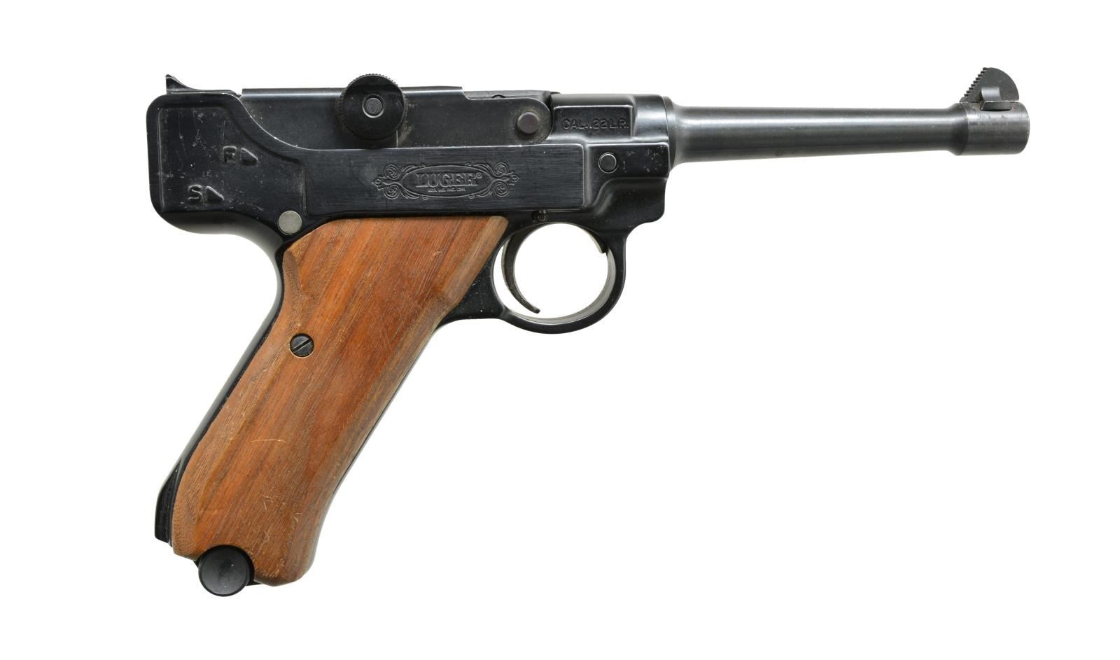 1) WALTHER P1. Cal. 9mm Luger. S# 206272. Bbl. 5”. Blued finish. Custom walnut grooved 2 piece grips. Mfg. 1977. MAGS: 1 - 8 rd. mag. CONDITION: overall very good w/ some high edge wear on frame & muzzle. Scattered light scratching. Good grips w/ a few minor abrasions. Near excellent bright shiny bore w/ deep, sharp rifling. (20-3660/ZAL). 2) STOEGER LUGER. Cal. 22 LR. S# 36201. Bbl. 5 1/2”. 2 Piece smooth walnut grips. Blued finish. MAGS: 2-10 rd. CONDITION: overall good w/ some scattered handling marks & light oxidation on muzzle of bbl. Very good bright shiny bore w/ sharp rifling. (20-3800/ZAL). BOTH MODERN. $400-600.