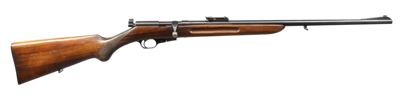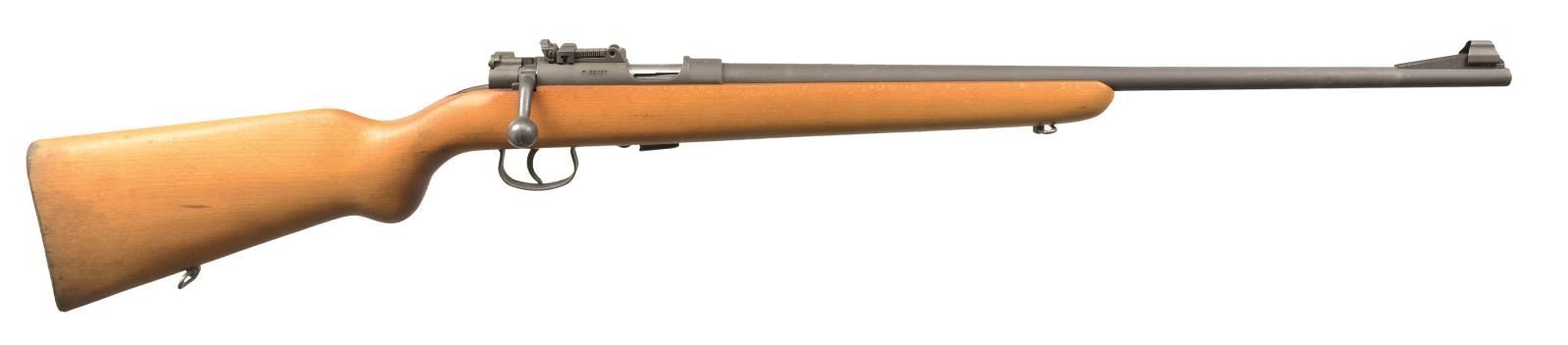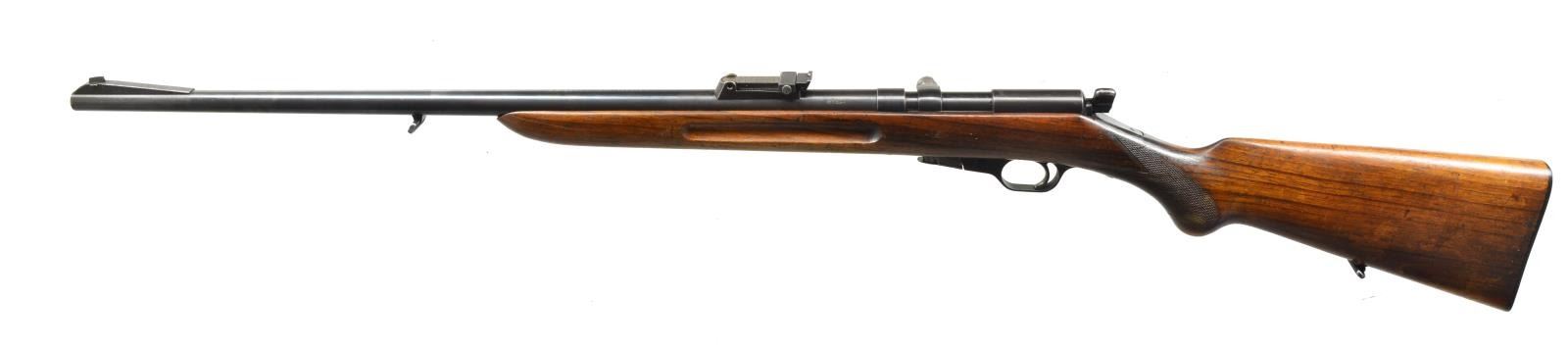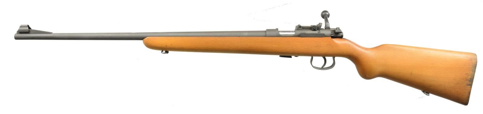 ALL: cal. 22 LR. 1) WALTHER MODEL 2 AUTOLOADING. S# 6283. Bbl. 24 1/2" has silver filled marking "B.H. DYAS in LOS ANGELES". Ramp mounted blade front sight w/ graduated tangent rear sight. Action will function as an autoloader when bolt handle is up, or bolt action when handle is down. Finger groove rnd. knob walnut stock w/ checkered wrist, sling swivels & plastic buttplate. MAGS: 1 detachable 5 rd. CONDITION: over 80% lightly worn blue. Stock has worn finish showing numerous scratches & marks w/ lg. cracks in wrist & action areas. Bright bore w/ sound rifling. (20-3030/DS). 2) MAS MODEL 45. S# F32151. Bbl. 24" rnd. w/ hooded ramp mounted blade front sight & graduated tangent peep rear sight. Gray parkerized type metal finish. Rnd. knob hardwood stock w/ sling swivel & steel buttplate. Bottom of bbl. has Davidson import marking. MAGS: 3 detachable 5 rd. CONDITION: 95% metal finish showing light scuffs & spot of corrosion. Original stock finish has water damage & dark staining around buttplate. Buttplate has areas of red rust. Bore is bright w/ strong rifling. (20-3046/DS). ALL CURIO. $600-800.