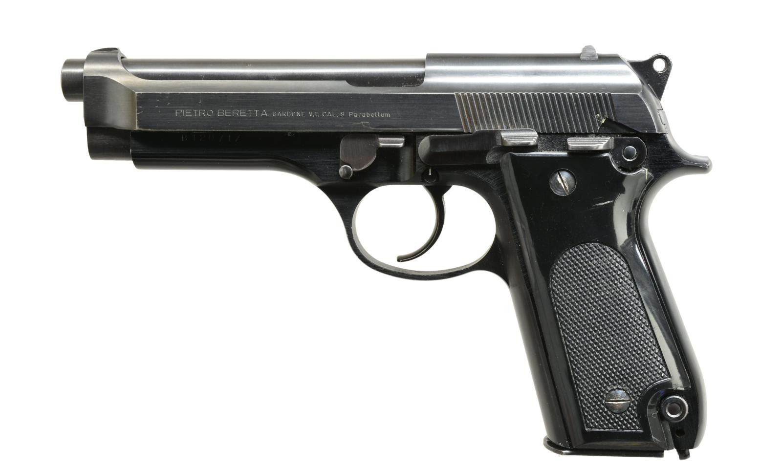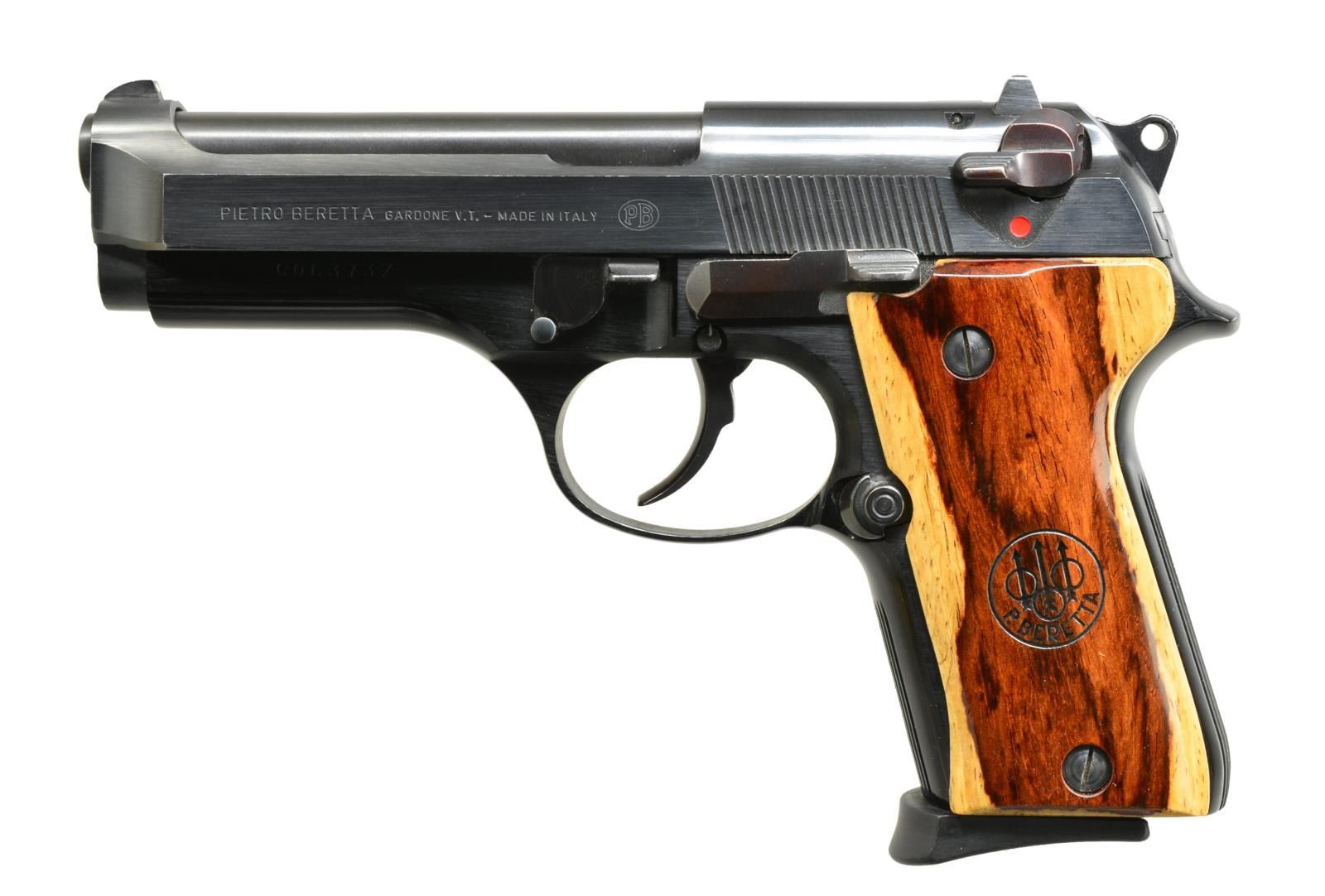 1) Cal. 9mm Luger. S# B12071Z. Bbl. 5”. Early Beretta model 92 w/ safety located bottom of backstrap instead of the familiar thumb location. These early guns had no decocker which became synonymous w/ later traditional DA models. Serrated slide w/ left side controls. Fixed integral blade front sight. Drift adj. rear notch. Blued finish w/ black plastic grips. MAGS: 2 - 15 rd. mags. CONDITION: original finish on exposed metal surfaces mostly complete w/ thinning on high spots & areas of mechanical interface. Shiny bore w/ good rifling. (20-3932/JZ). 2) SB COMPACT. Cal. 9mm Luger. S# C06373Z. Bbl. 4 1/4”. Desirable compact Beretta SB model w/ 2 tone laminated grips & factory blue finish. Ambidextrous safety decocker w/ enlarged slide release. This model has mag. release behind trigger guard in the traditional American position. Serrated slide. 2 Dot drift adj. sighting system. MAGS: 1 - 13 rd. mag. UNATTACHED ACCESSORIES: factory slimline checkered wood grips. CONDITION: original exterior finish is complete & uniform w/ light thinning on high marks & areas of mechanical interface. Custom grips have what appear to be natural depressions w/ clear visible logo on each side. Mechanism functions smooth. Shiny bore w/ good rifling. (20-3937/JZ). BOTH MODERN. $700-1,100.