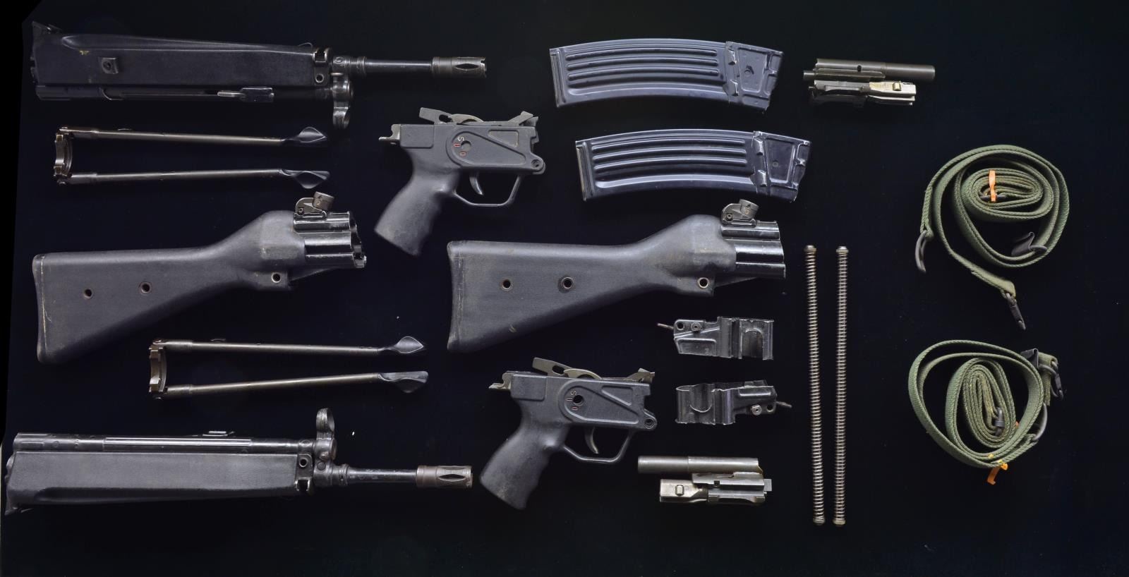 BBLS. Cal. 223. Bbl. 16.5" over flash hider. Malaysian contract HK33 parts kits appear to be extremely complete, less the obvious receiver sections. Important receiver pieces that correspond w/ sm. parts necessary to complete a build are included such as end cap section w/ rear sight & center section that includes paddle mag. release components. Parts include: rear stock, S-U-O trigger frame complete w/ selector & fire control group. Bolt & carrier w/ recoil spring. Original bbl. assembly w/ charging mechanism, front sight, hand guard, bipod & flash hider. Carry handle & sling. Bayonet, cleaning kit & aluminum 40 rd. mag. & takedown pins. MAGS: 2- factory 40 rd. CONDITION: as issued w/ receiver sections cut per BATFE requirements. All sm. parts corresponding w/ cut pieces appears serviceable. Bores are shiny w/ obvious rifling. (02-14078-2/JZ). $1,200-1,800.