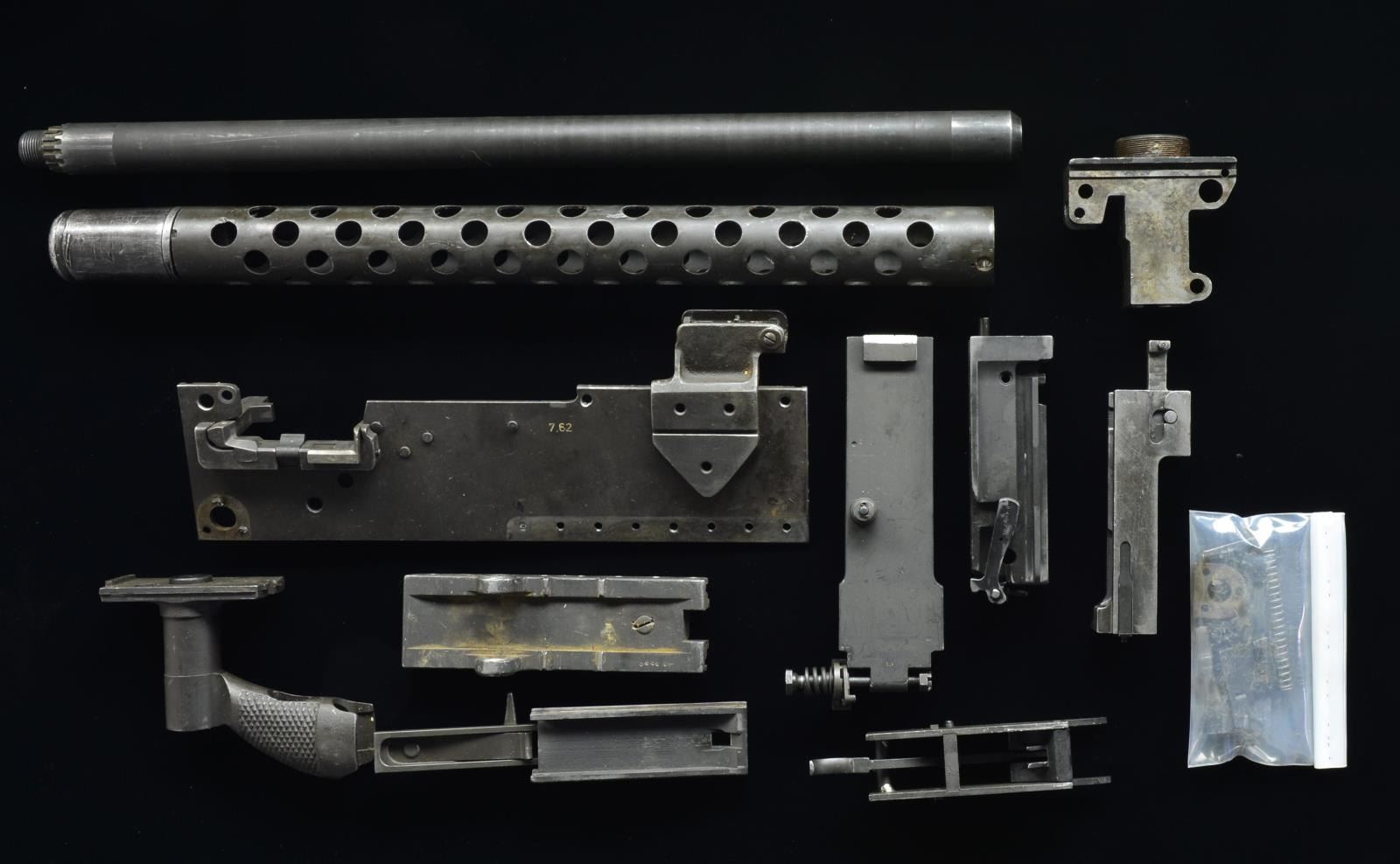 Cal. .308. Bbl. 24". Israeli model 7.62 NATO version of the time proven Browning model 1919 A4 machine gun. Parts kit appears mostly complete, missing only the right side plate & perhaps a few sm. incidentals such as rivets. Notable parts include bbl., bbl. jacket, booster, left side plate, front trunnion, rear plate / pistol grip, bolt, top cover, bottom plate, bbl. extension, trigger & accelerator mechanism, top cover latch, front & rear sights, cocking handle, etc. These parts kits are perfect for assembly by a title II manufacturer, as a functional dealer sample MG or for a civilian to make either a semi automatic variant or display model. CONDITION: these parts appear to have been assembled at one point, though it doesn’t appear that any heavy use would influence future operation. (02-14071-5/JZ). $900-1,400.