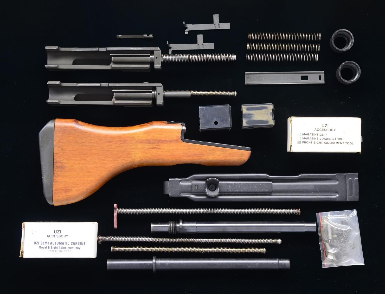 Several parts & accessories for Uzi SMG & Carbine models, including: 2 bbls., 1-9 1/4" w/ threaded muzzle, the other 1-10 1/4" w/ out threaded muzzle. 1 Wooden stock of unknown origin. / Uzi Action Arms front sight adj. tool in box. / Action Arms sight adj. key in box. / 2 Model B bbl. nuts. / 1 Semi auto top cover. / 2 SMG recoil springs. / 2 Semi auto bolt assemblies that appear to be complete w/ all pins & springs except for 1 extractor retaining pin. / Multiple spare springs & top cover parts. All parts & accessories appear to have been used very little, if any at all. Stock has few light impressions & handling marks. (02-13777-5/JZ). NONGUN. $500-800.