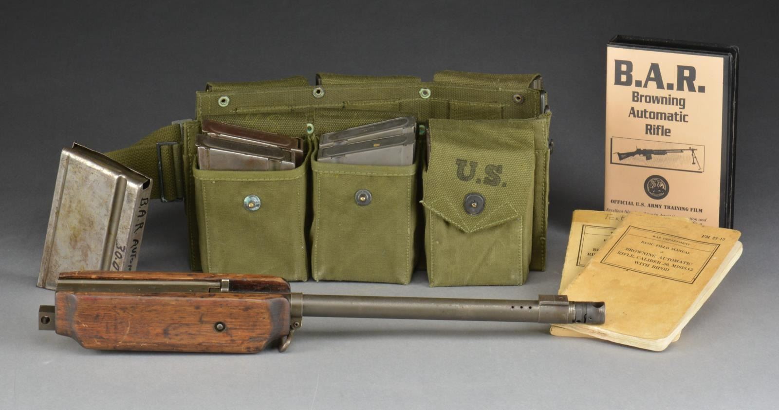1 Green canvas mag. holder for 12 BAR mags. w/ pouches. 13 - 20 rd. mags total. 1 BAR gas tube w/ forend & front sling swivel. 2 Browning field manuals numbered “FM23-15”. 1 VHS tape copy of original U.S. Army training film. CONDITION: mags range from good original Parkerizing to shiny w/ period correct patina. (02-14005/JZ). $200-300.
