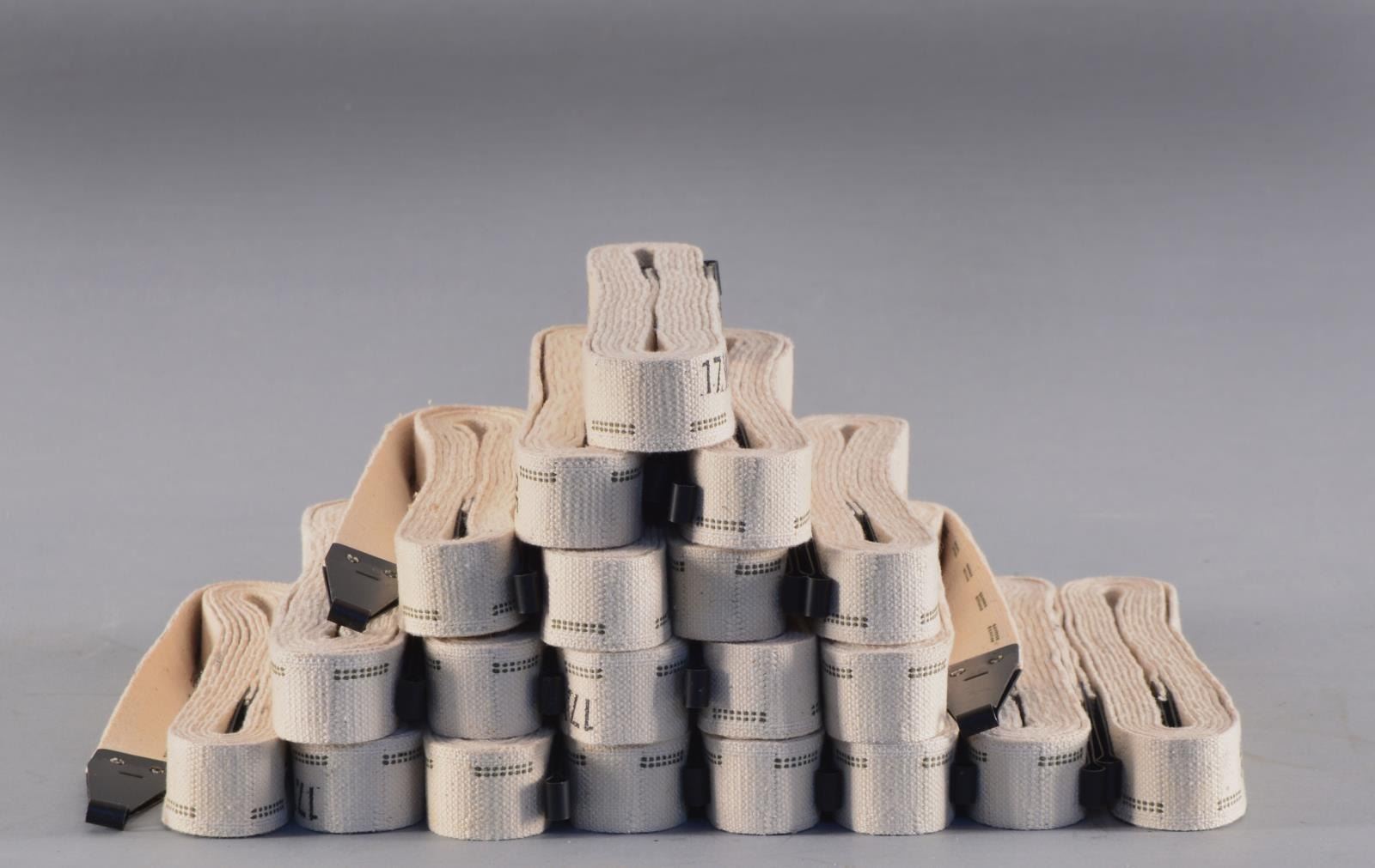 Steel tabs in what appears to be as new condition. There doesn’t appear to be any of the normal stretching that accompanies usage. Most if not all appear to be stamped Lot “59-76”. (02-13776-6/JZ). $700-1,100.