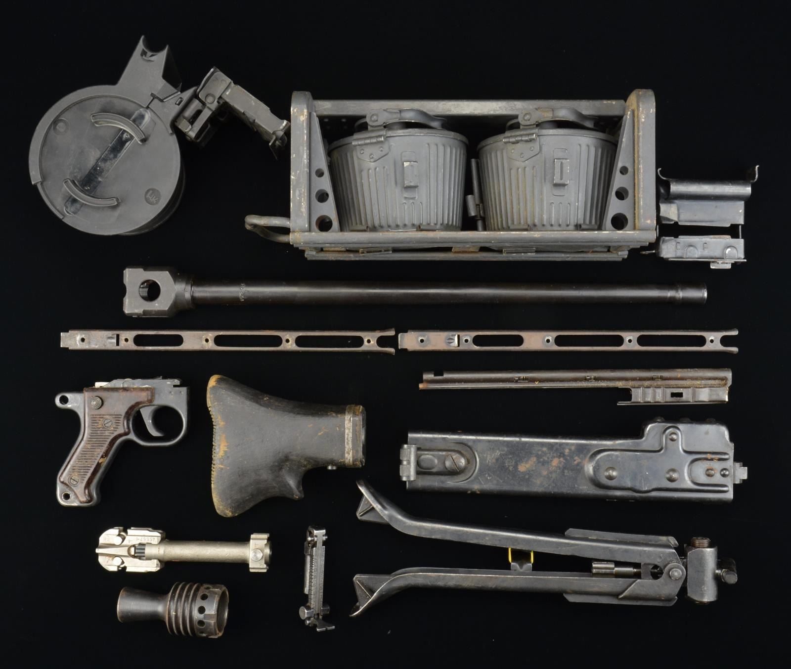 Included in this lot are 2 PKM belt boxes, each w/ lg. section of belt. 1 Box w/ smooth sides, the other ribbed & emblemized w/ star in center. (02-14554/JZ). MG42 PARTS: 1 MG42/MG3 bbl. 21" long. 7.62x51 NATO. / 1 Charging handle assembly. / Buffer unit parts. / Misc. sm. receiver & feed parts. / Front sight marked w/ waffenamt. / Misc. springs. STEN MK2 PARTS: 3 Bolts, complete w/ extractors. / 1 Recoil spring. / 2 T stock. / 1 Loop stock / 2 Mag. well marked “STEN MK2”. / 1 Mag. well unmarked. / 3 Bbl. assemblies, including front trunnion & extensions. / 3 Trigger groups & guards, empty. UZI PARTS: 1 SMG bolt, empty. / 1 Hebrew marked trigger group, complete. / 1 Bbl. trunnion. / 1 SMG 10" bbl. / 1 Ratcheting top cover. / 1 Mag. jungle clip. / 2 Wooden stocks. (02-14680 & 02-14682/JZ). M16 PARTS: 1 Early steel folding bipod. CONDITION: bbl. bores look good, all parts appear serviceable, though removed from original firearms. (02-14557/JZ). 24" Browning 1919 30-06 bbl., has shiny bore w/ decent rifling. (02-14681/JZ). $500-800.