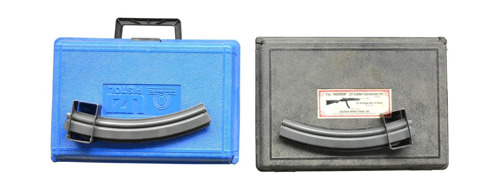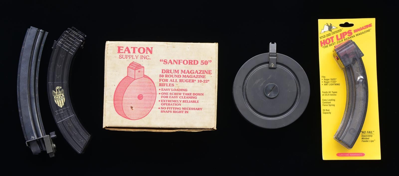 1 Eagle 30 rd. 1022 mag., which appears to be as new. / 1 Hot Lips 25 rd. 1022 mag., new in factory packaging. / 1 Eaton/Sanford 50 rd. 10/22 drum in box w/ instructions, if it has been used it’s little enough that it is not apparent. / 1 Bingham Ltd. 10/22 mag. adapter & 1 PPS 50 Puma 30 rd. mag. / 1 Bingham PPS 50/22 50 rd. drum. (02-13776-22/JZ). NONGUN. $100-200.
