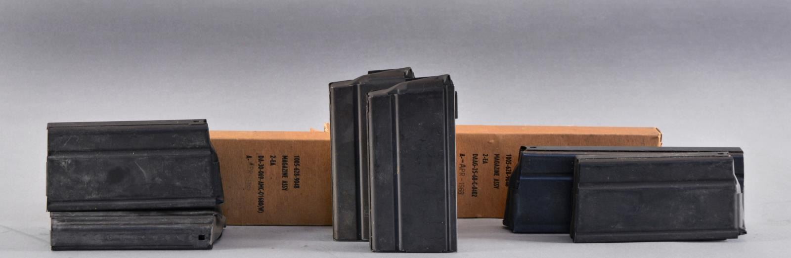 9-20 Rd. mags., as well as 1-30 rd. mag. The 20 rd. mags. are parkerized & appear to be contract mags., while the 30 rd. is blued & of unknown origin. 4 Of the 20 rds. are in factory packaging dated 1968. (02-13776-27/JZ). NONGUN. $150-300.