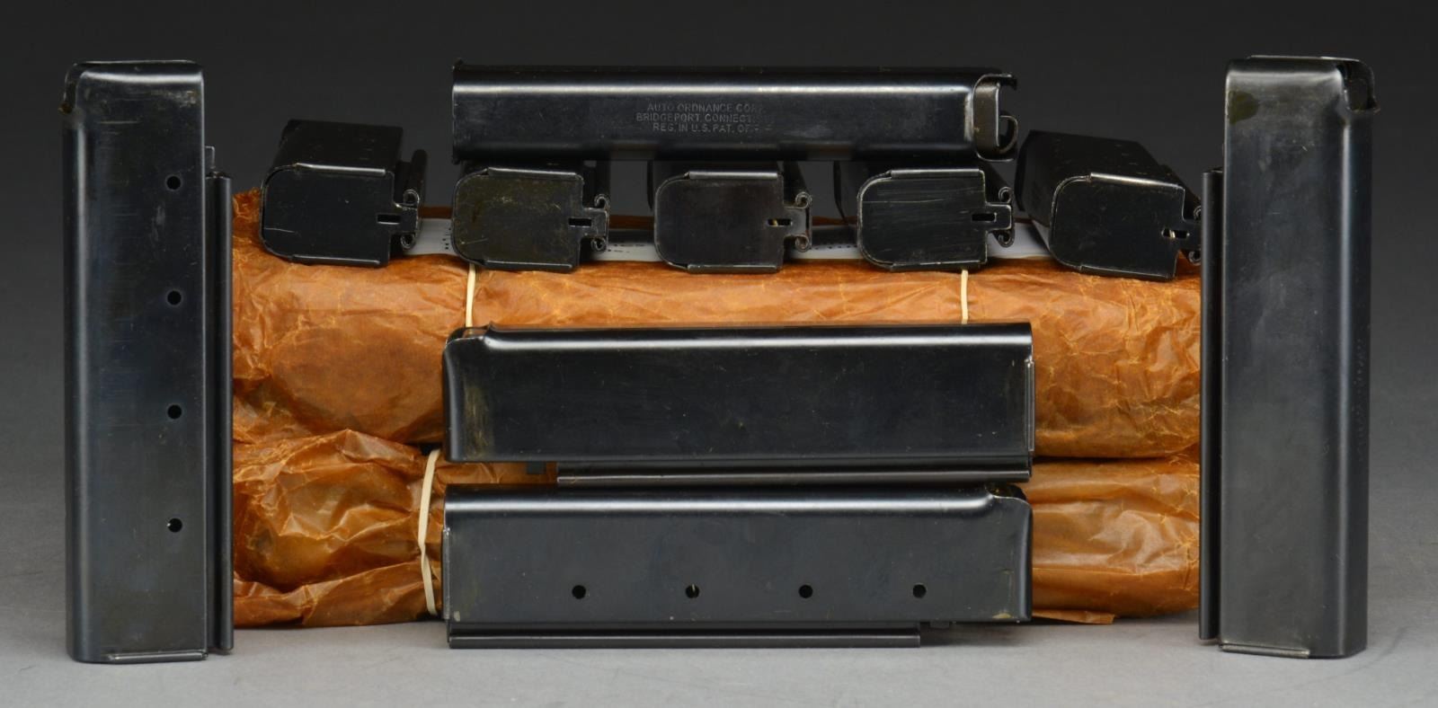 WRAPPERS. 3 Oil wrapped packages containing 10 mags. each. 20 Rds. early Auto Ordnance mfg. patent marked. Mags. are marked “AUTO ORDNANCE CORP. / BRIDGEPORT, CONNECTICUT / REG. IN U.S. PAT. OFF”. All mags are blued finish. (02-14057/JZ). $900-1,500.