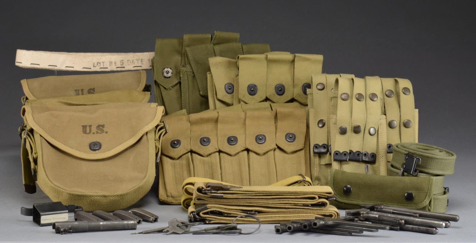 PARTS. Varied lot both US & Israeli. Issued items are good used condition, reproduction items in very good condition. May have sm. tears, light staining or wear, but appear in good serviceable condition. Included is: 4 sets of Israeli Model 1919 Browning wrenches & broken shell extractors. / 1 Steyer 8mm pistol stripper clip. / 1 National match sight set for Springfield Armory M1/M1A. Set is complete w/ conversion drawing in factory sealed pouch. / 1 Cobrey M11 mag. loader. / 1 M1 Carbine brass deflector. / Model 1911 parts include: unmarked bbl. w/ link. / 4 Arched main spring housings (1 checkered, 3 grooved). / 1 Grooved flat mainspring housing. / 2 Short triggers. / 1 Grip safety. / 5 Rear sights & assorted sm. parts. / 2 Original US Model 1917 Kerr Nobuckl slings. / 3 Reproduction US Model 1917 Kerr Nobuckl slings. / 2 Thompson SMG 3-pocket mag. pouches dated “1944”. / 2 Thompson 5-pocket mag. pouches (1 marked “US”, 1 marked “USMC 1942”). / 1 Reproduction cloth Browning MG belt dated “10-76”. / 5 Thompson SMG drum pouches (1 marked “RMCO 1942”, 1 marked “RUSCO”, 3 marked “BOYLE”. / 2 US mag. pouches marked for “SMG M3”. / 3 Green web Canadian rifle slings. / 3 Israeli SMG mag. pouches for 3 mags. / 1 Israeli SMG mag. pouch w/ 3 mag. compartment & separate 2 mag. compartment. / 2 M14 cleaning & accessory kits, 1 w/ belt carrier. (02-13776-34/RW). $300-500.
