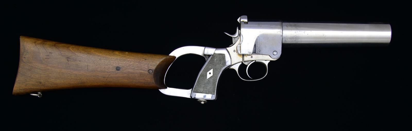 Cal. 1 1/2" Flare. S# 10330. All matching numbers including the stock. Smooth walnut detachable stock w/ lanyard rings. Federal Laboratories Inc. is stamped into the butt. A nice eye catcher for a collectors gun room. CONDITION: very good custom nickel finish w/ strong factory & arsenal markings. Scattered handling marks & minor flaking finish. Very good butt w/ some dents. Very good bore. (02-14647/ZAL). $600-1,000.