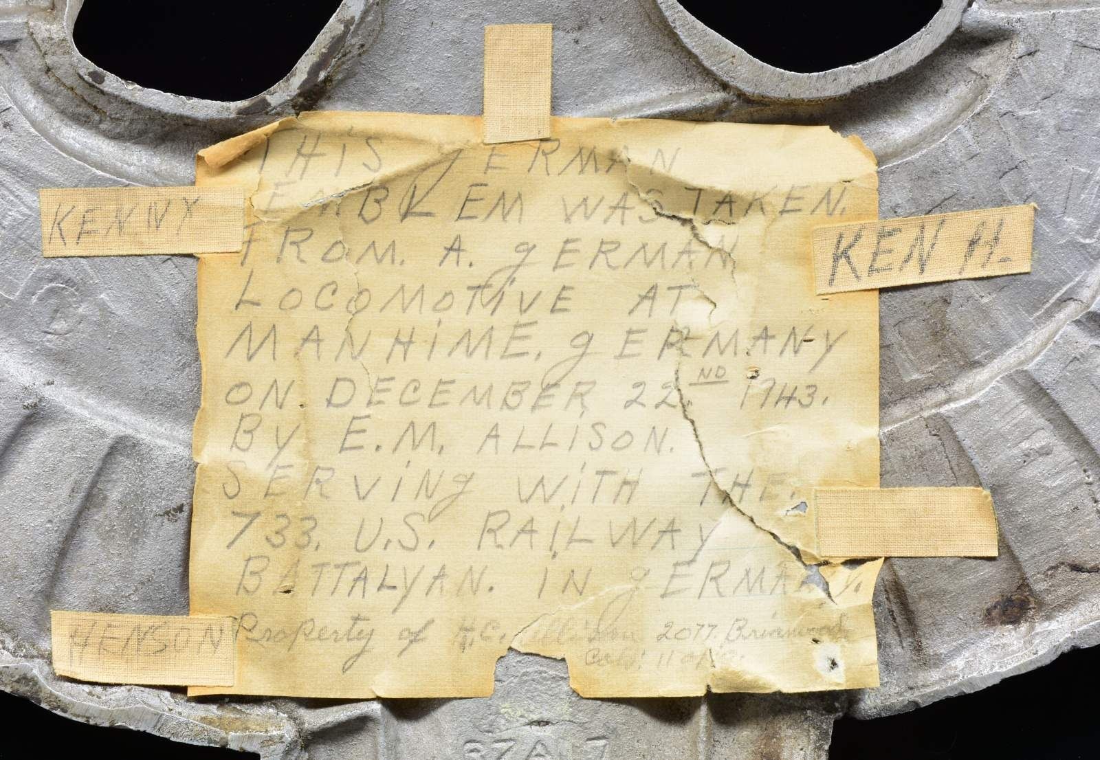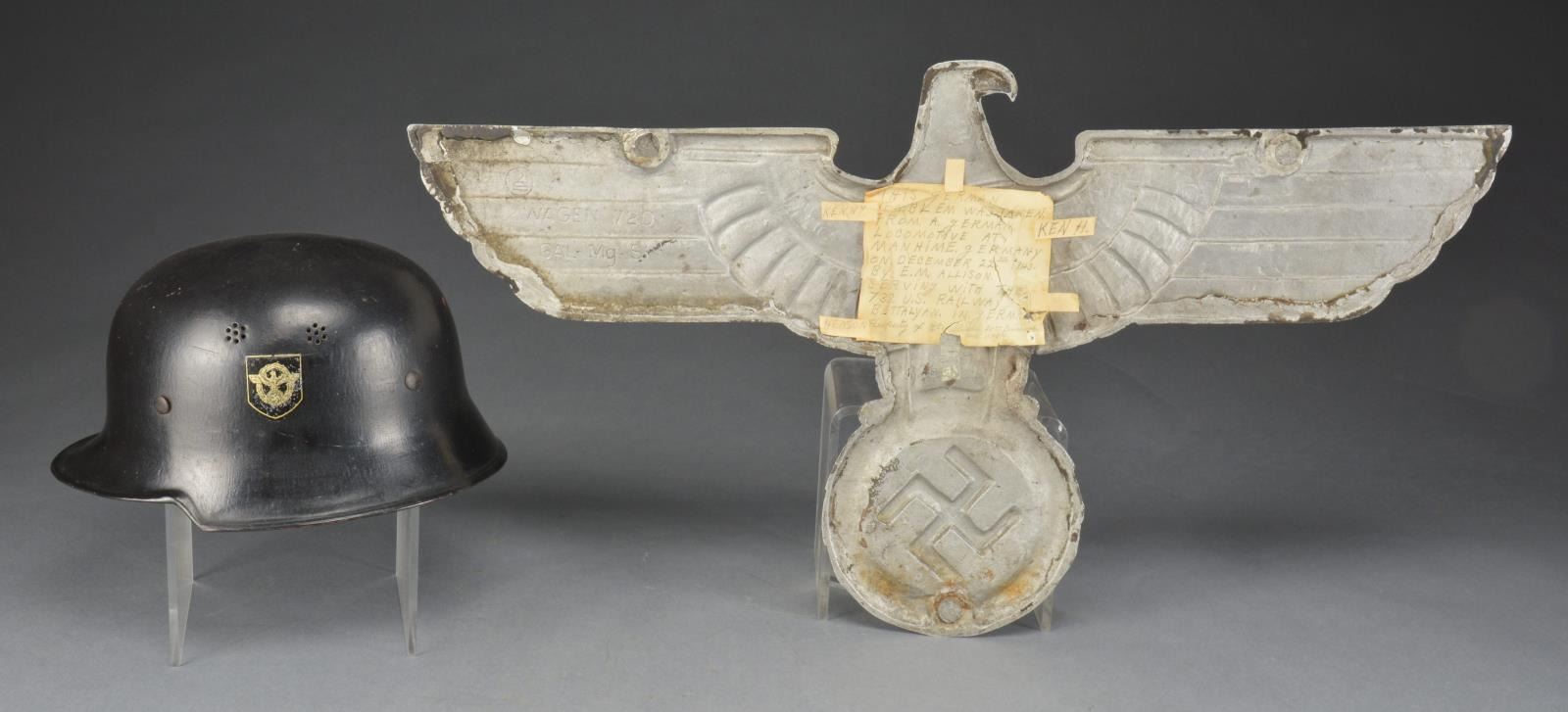 & MORE. 1) 2ND MODEL LUFTWAFFE DAGGER. Overall length: 17". Blade marked at the ricasso, “(knight’s head)WKC SOLINGEN”. Aluminum crossguard & pommel. Aluminum wire wrapped orange grip w/ portepee attached. Plated scabbard. CONDITION: blade shows original factory polish. Remainder of dagger shows light wear. 2) FIREMAN’S BAYONET. Overall length: 16". Single fullered, unmarked blade. Plated crossguard & pommel w/ 2 piece black composite checkered grips. Black enameled scabbard & black frog w/ fireman’s knot attached. CONDITION: blade shows original factory polish. Hilt & scabbard show light wear. Frog & knot show moderate wear. 3) CIVIL POLICE HELMET. A lightweight, double decal, black police helmet w/ two 7 hole vents on each side. Simple brown leather, 9 tongue liner w/ partial chinstrap. CONDITION: painted finish is 99%. Decals are 98%. Liner shows light wear except as noted. 4) POKER CHIPS. A group of 5 poker chips, 4 of which have Party symbols on both sides. CONDITION: light wear. 5) 4 POLICE PATCHES. Patches are for various precincts & are pink thread embroidered on black wool. CONDITION: patches show some moth damage. 6) MEDALS. 3 Award medal bar for a fireman including 2 pre-WWII Fire Service awards & an enameled WWII Fire Service Cross. / Single award medal bar w/ a gold plated Prussian 40 Year Fire Service medal. / 25 Year Fire Service medal. CONDITION: medals show light wear. Ribbons show moderate wear. 7) RAILROAD EAGLE. Lg. aluminum railroad locomotive eagle w/ a width of 28 3/4" & 15 1/2" in height. The rear of the eagle marked, “WAGEN 720 GAL-Mg-Si”. There is capture paperwork stuck to the back of the eagle stating in part that the eagle was captured December 22, 1943 by E.M. Allison. CONDITION: eagle has a distinctive casting & shows light wear overall. 8) BOOK. A loose leaf book on 3rd Reich railroad car eagles. CONDITION: like new. (02-13988/BF). $1,300-2,000.