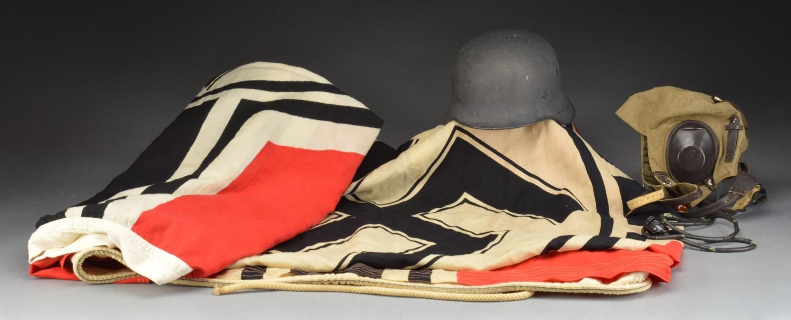 This lot consists of 2 lg. WWII German Kreigsmarine printed battle flags w/ appropriate Kreigsmarine eagle & “M” markings on the heading. There is also a WWII battle helmet of M42 style w/ original paint, no decals (as issued) & no liner. Finally, there is a cloth German flight helmet w/ throat mike, plug in cord & wool lined, leather covered earphones. CONDITION: flags generally show light wear, however 1 has wear to the ends of the heading. Helmet shows light wear but is missing all of the liner except the band. Flight helmet shows light wear but has degradation to the rubber surrounding the attachment cord. (02-14042/BF). $800-1,100.