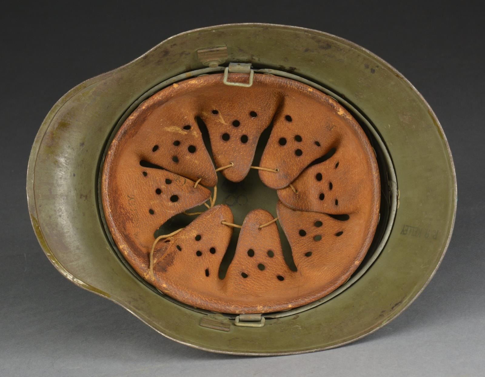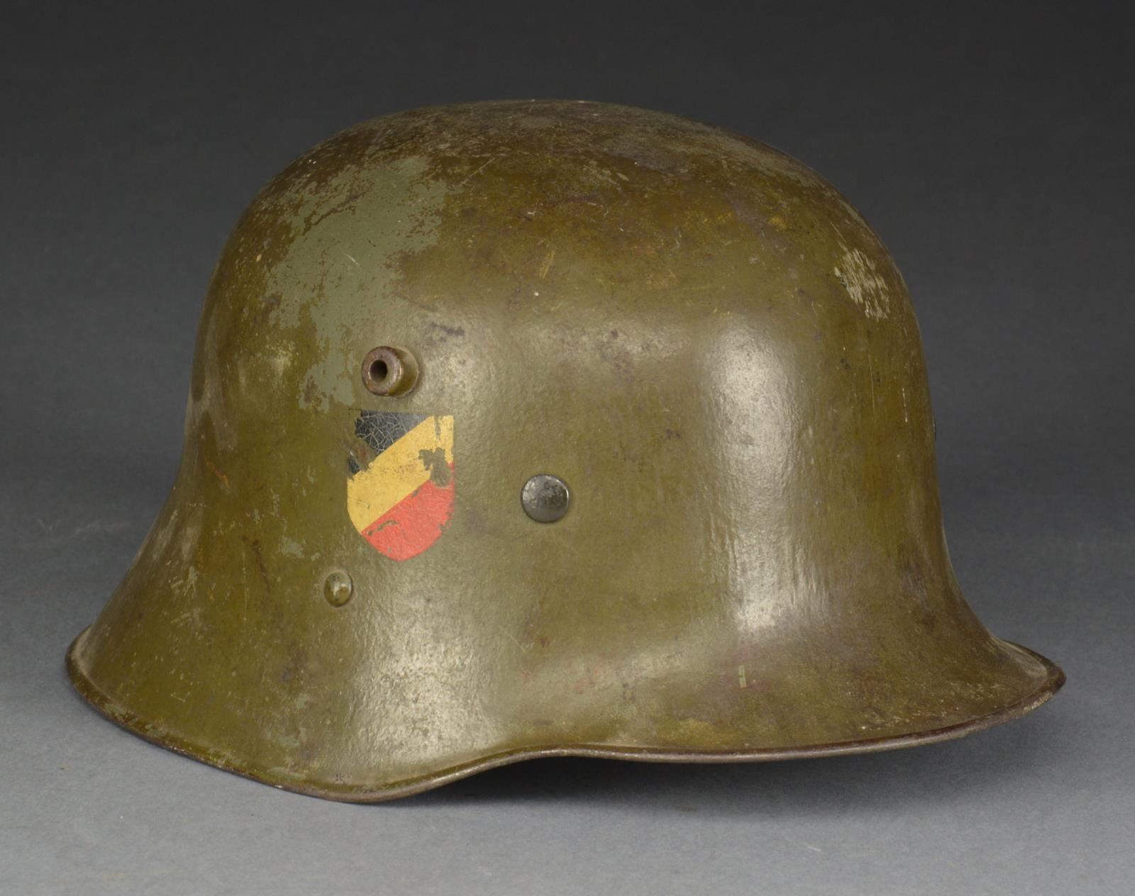 Helmet is a classic Model 1916 Austrian w/ the high chinstrap rivet on each side. Helmet was repainted & Wehrmacht/National decals were added. Helmets like this were issued to the German Army prior to adoption of the M1935 helmet. 8 Finger leather liner likely replaced during reissue. No chinstrap. CONDITION: period repainted finish is appx. 85%. Wehrmacht decal is 95%+. National decal is 85%. Liner shows light to moderate wear. (02-14166/BF). $300-500.