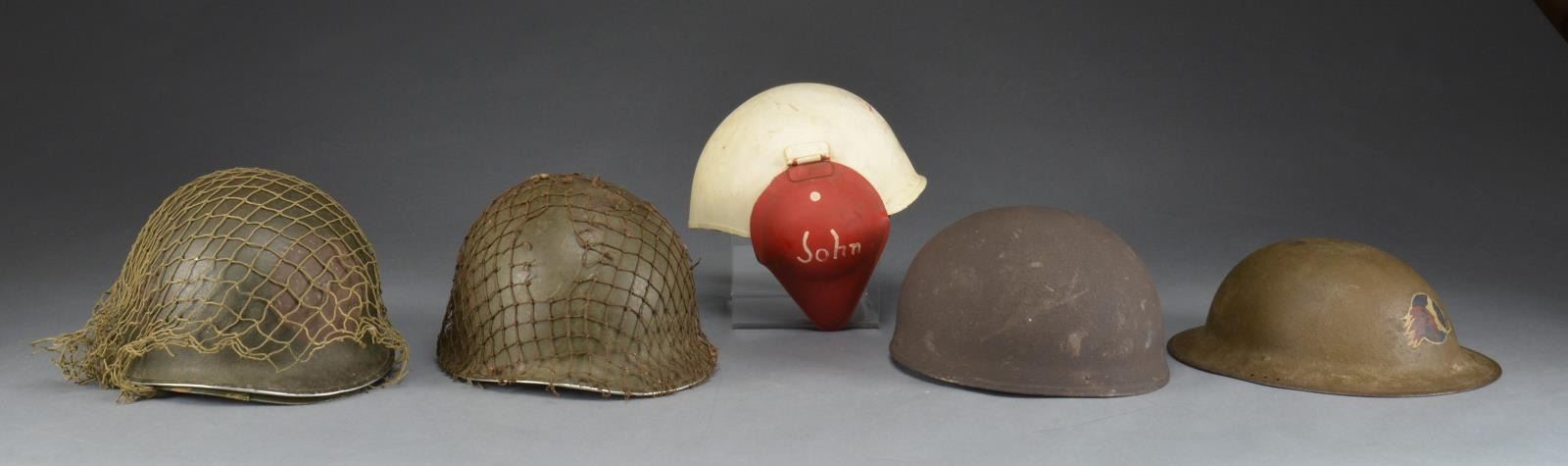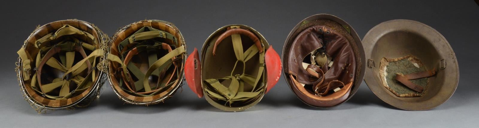 1) M5 HELMET. The M5 Flak helmet was utilized by the USAAF in WWII. It became necessary to provide more protection to bomber crews than a leather flight helmet could provide. The new M3 was developed & first saw use in 1943, followed by the M4 & finally the M5 was issued to crews starting in January 1945. This example has a white painted body w/ a well worn red “B C” on the front. The ear flaps are both painted red w/ the name “John” on each flap. Leather & OD cotton web lining. CONDITION: paint shows some wear & there are scattered areas of oxidation. Liner is intact & functional. (02-13967/BF). 2) 2 WWII US M1 HELMETS WITH NETTING. 2 WWII fixed bail, front seam helmets. 1 Helmet has a WWII period liner, the other has a Korean War era liner. Both helmets have a net covering. CONDITION: WWII example has a circular oxidized area on the front & back where it appears that an insignia was scraped off & the helmet finish was removed. The later helmet shows light to moderate wear overall. (02-13969/BF). 3) WWII BRITISH MOTORCYCLE DISPATCH HELMET. Helmet has a dark green sanded finish w/ 4 sm. rivets near the rim. Felt lined, leather, lace up liner that covers the ears & is secured w/ a leather chinstrap. There is thick padding between the liner & the helmet body & a white cotton tape crown to support the helmet. CONDITION: helmet shows very light wear overall. (02-13975/BF). 4) WWI US M1917 HELMET. A standard US issue WWI helmet w/ painted insignia on the front. The insignia belongs to the 26th Infantry Division of the 101st Field Artillery Regiment. The insignia shows a Native American chief’s head superimposed over the coastline of Massachusetts inside a white edged blue circle. No liner or chinstrap. CONDITION: helmet shows moderate wear. Painted insignia is contemporary & remains quite clear. (02-13976/BF). $700-900.