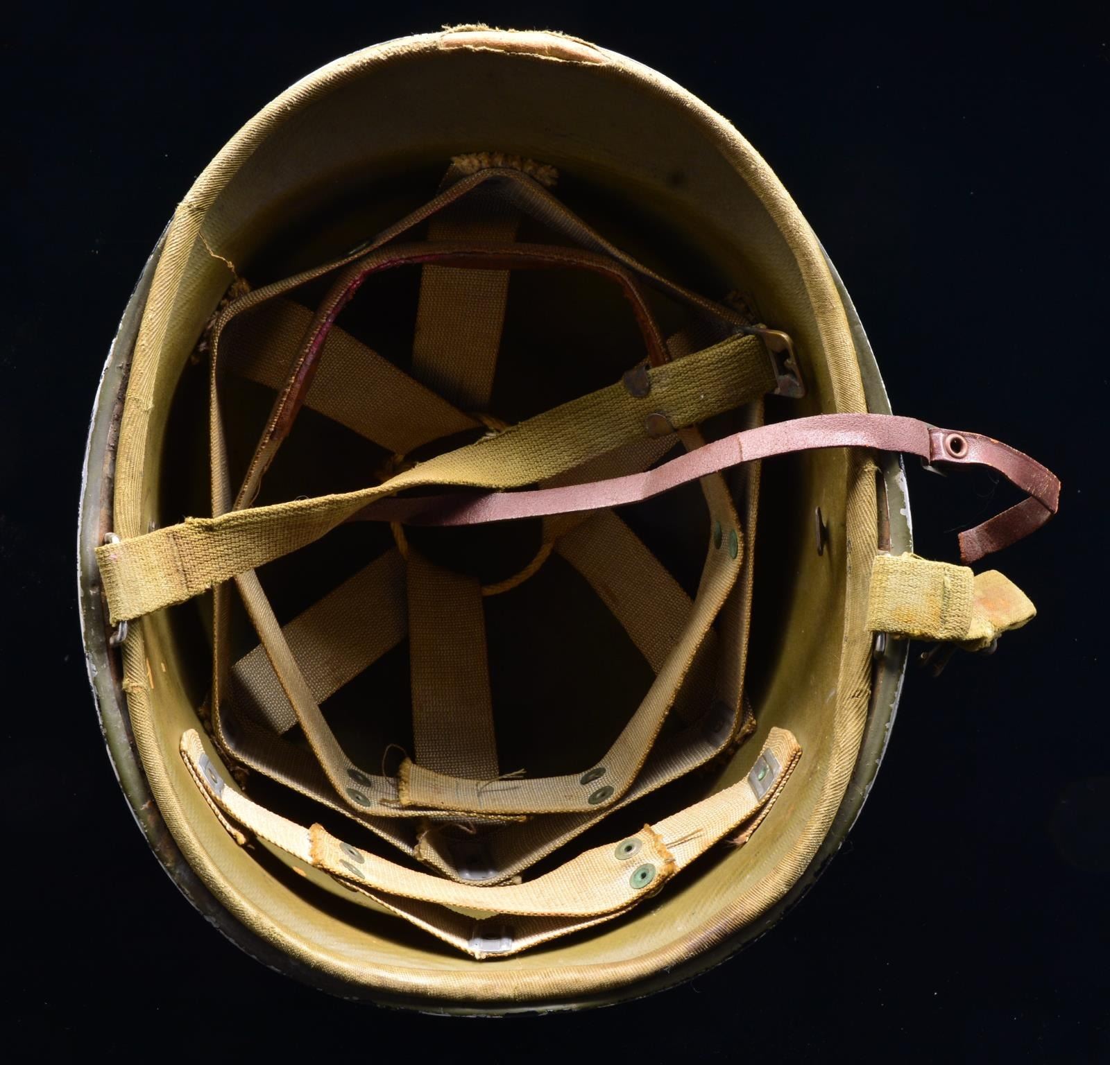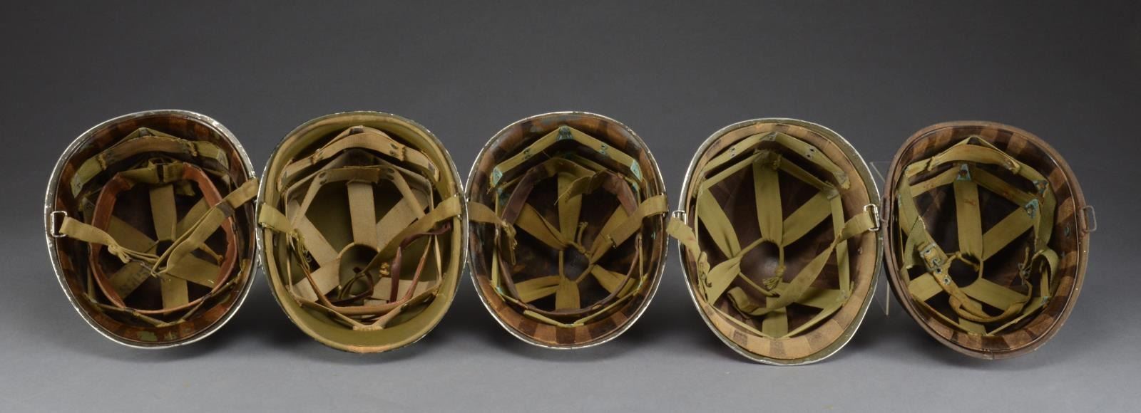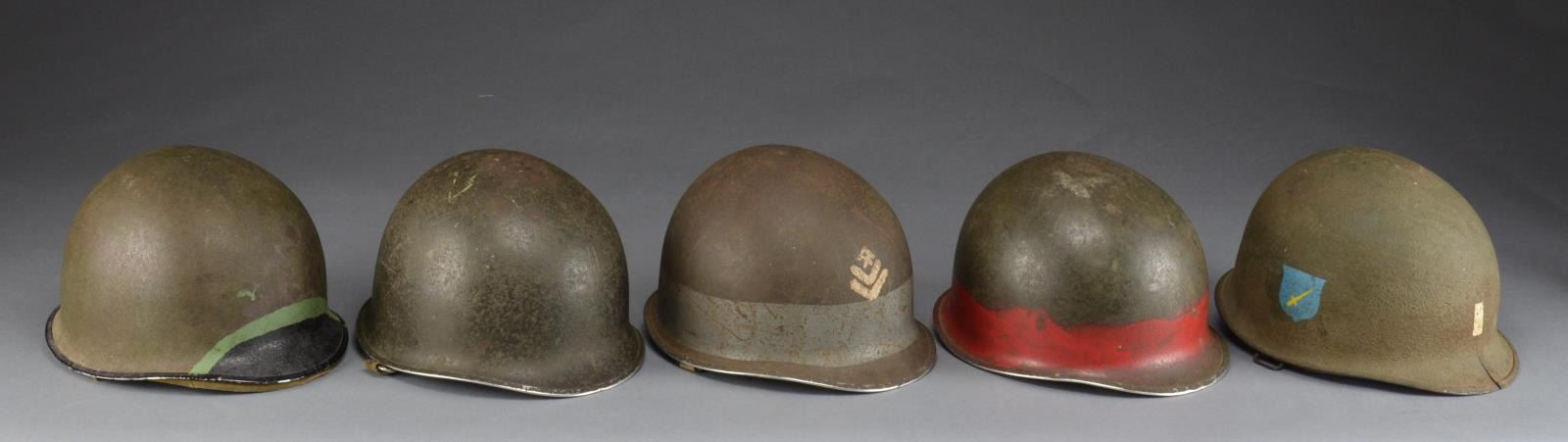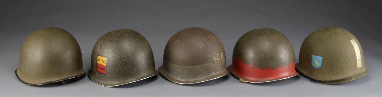 1) WWII front seam, fixed bail helmet w/ correct period liner. Outside of helmet is painted w/ blue/gray 2 1/4” stripe around the base of the helmet w/ 2 upside chevrons painted in white on the front. The back is painted, “I.E.B.” also in white. CONDITION: helmet shows expected wear on the outside. Liner is complete though moderately worn. Metal parts have green verdigris. Chinstrap is incomplete. 2) WWII front seam, fixed bail helmet w/ early Hawley liner. Outside of helmet is painted black around the bottom rim & for about 2” up the front w/ a green 3/4" band above that. CONDITION: helmet shows substantial original finish w/ expected wear. Hawley liner shows minor abrasions to the edges. Cotton chinstrap is complete. Leather interior strap on liner is broken but present. 3) WWII front seam, swivel bail helmet w/ correct period liner. Outside of helmet has a 1st Lt. bar painted in white on the front. The rear has a 4” x 1” white bar painted on the back. Helmet has a paratrooper chinstrap. Right side of helmet has a painted 2” blue shield w/ a yellow diagonal sword on it. CONDITION: helmet shows light to moderate wear overall. Liner is worn but intact. Metal interior parts have some verdigris. There is a 1 1/2" crack in the front of the helmet likely from an edge impact. 4) WWII front seam, swivel bail helmet w/ correct period liner. Outside of helmet has a painted red band around the lower edge appx. 2” wide. Cotton chinstrap. CONDITION: helmet has some shallow dents in the top but retains most of its painted finish. Liner is complete. Chinstrap shows fraying but has no losses. 5) WWII front seam, swivel bail helmet w/ correct period liner. Outside of helmet is painted on the left side w/ a squared shield painted yellow on the top & red on the bottom. The word “BATTLE” appears on the yellow section. The red section reads “PATROL”. CONDITION: helmet retains most of its original finish. There are some minor shallow dents on the top. Liner is complete as is the chinstrap. (02-13970/BF). $1,000-1,600.